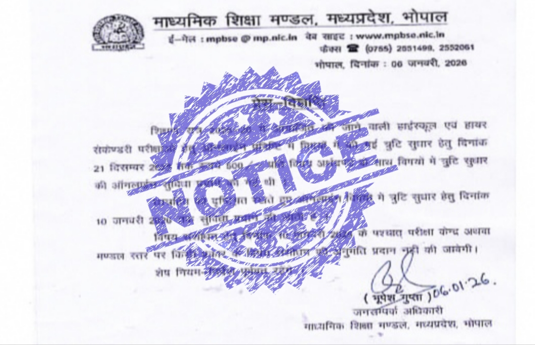 माध्यमिक शिक्षा मण्डल, मध्यप्रदेश ने शिक्षा सत्र 2025–26 में आयोजित होने वाली हाईस्कूल एवं हायर सेकंडरी परीक्षाओं के लिए ऑनलाइन आवेदन,प्रविष्टि में दर्ज विषयों की त्रुटि सुधार को लेकर महत्वपूर्ण सूचना जारी की है। मण्डल द्वारा विद्यार्थियों की सुविधा को ध्यान में रखते हुए प्रति विषय 500 रुपये शुल्क के साथ विषय त्रुटि सुधार की ऑनलाइन सुविधा की अंतिम तिथि 21 दिसम्बर 2025 थी। छात्रहित को ध्‍यान में रखते हुए मंडल ने इस सुविधा को पुनः बढ़ाते हुए अब 10 जनवरी 2026 तक कर दिया है।माध्यमिक शिक्षा मण्डल ने स्पष्ट किया है कि निर्धारित तिथि के पश्चात परीक्षा केन्द्र अथवा मण्डल स्तर पर किसी भी प्रकार के विषय संशोधन की अनुमति नहीं दी जाएगी। शेष सभी नियम एवं निर्देश पूर्ववत लागू रहेंगे।