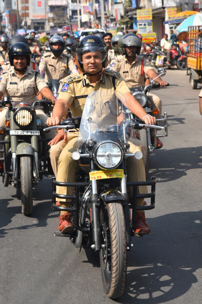 ప్రతి వాహనదారుడు ట్రాఫిక్‌ నిబంధనలను పాటిస్తూ క్షేమంగా గమ్యస్థానాలకు చేరుకోవడమే మనందరి లక్ష్యంగా మార్చుకోవాలని వరంగల్‌ పోలీస్‌ కమిషనర్‌ పిలుపు నిచ్చారు జాతీయ రోడ్డు భద్రత మాసోత్సవాలను పురస్కరించుకోని నగర ప్రజలకు ట్రాఫిక్‌ నిబంధనలతో పాటు హెల్మెట్‌ ప్రాదాన్యతపై అవగాహన కల్పించడం కోసం వరంగల్‌ ట్రాఫిక్‌ పోలీసుల అధ్వర్యంలో బైక్‌ ర్యాలీని ఏర్పాటు చేసారు.ఈ కార్యక్రమానికి వరంగల్‌ పోలీస్‌ కమిషనర్‌ ముఖ్య అతిధిగా హజరయి ర్యాలీ ప్రారంభించిన అనంతరం పోలీస్‌ కమిషనర్‌ సైతం అధికారులు,సిబ్బందితో కలసి హెల్మట్లను ధరించి బైక్‌ ర్యాలీ పాల్గోన్నారు. వరంగల్‌ పోలీస్‌ కమిషనరేట్‌ పరేడ్‌ మైదానం నుండి ప్రారంభమైన హన్మకొండ చౌరస్తా, ములుగు రోడ్‌, యం.జి.యం, పోచమ్మమైదానంలోని ఎస్‌.ఆర్‌ కళాశాల వరకు కొనసాగింది. అనంతరం విధ్యార్థులతో ఏర్పాటు చేసిన సమావేశంలో పోలీస్‌ కమిషనర్‌ మాట్లాడుతూ దేశ వ్యాప్తంగా ప్రస్తుతం జరుగుతున్న రోడ్డు ప్రమాదాలు పెద్ద సమస్య మారిందని, ముఖ్యంగా ఈ ప్రమాదాలు వాహనదారులు ట్రాఫిక్‌ నిబంధనలు పాటించక పోవడమే కారణరమవుతోందని. ప్రధానం హత్యలు కన్నా రోడ్డు ప్రమాదాల కారణంగా మరణించిన వారి సంఖ్య అధికమని. పోలీసులు, ప్రభుత్వాలు ఎన్ని చర్యలు చేపడితే కొద్ది వరకు రోడ్డు ప్రమాదాలను నివారించగలం కాని వాహనదారులు తమ వ్యక్తిగత బాధ్యతగా భావించి ట్రాఫిక్‌ నిబంధనలను పాటించడం అవలంబిస్తే ప్రస్తుతం జరిగే రోడ్డు ప్రమాదాలకు చెక్‌ పెట్టగలమని, గత ఏడాది వరంగల్‌ పోలీస్‌ కమిషనరేట్‌ పరిధిలో జరిగిన రొడ్డు ప్రమాదాల కారణంగా 450కు పైగా మృత్యువాత పడ్డారని, అలాగే తోమ్మిడి లక్షల మంది వాహనదారులకు హెల్మెట్‌ ధరించని కారణంగా జరిమానాలు విధించడం జరిగిందని. ముఖ్యంగా మద్యం సేవించి వాహనం నడపటం కారణంగా వాహదారునితో పాటు ఇతరులు సైతం రోడ్డు ప్రమాదాలకు గురవుతున్నారని. ప్రతి వాహన దారుడు హెల్మెట్‌ ధరించాలని, మైనర్లను వాహనాలను అందజేయవద్దని, కారు నడిపే సమయంలో తప్పని సరిగా సీట్‌ బెల్ట్‌ ధరించడంతో ఇతర ట్రాఫిక్‌ నిబంధనలను పాటిస్తూ సురక్షితంగా మీ ఇండ్లకు చేరుకోవాలని, రోడ్డు భద్రతతో పాటు, ప్రస్తుత రోజుల్లో మత్తుపదార్థాల, సైబర్‌ నేరాలు సైతం ప్రస్తుతం మనందరి ముందు పెద్ద సమస్యని, యువత మత్తు పదార్థాల జోలికి పోవద్దని, వాటిని వినియోగించడం ద్వారా భవిష్యత్తు అంధకారంగా మారుతుందని, ఎవరైనా మట్తు పదార్థాలు వినియోగించిన, విక్రయించిన పోలీసులకు సమచారం ఇవ్వాలని, అలాగే సైబర్‌ నేరాల పట్ల ప్రతి ఒక్కరు అప్రమత్తం వుందాలని, తప్పుడు ప్రకటనలు, ఉచితాలు, ఉద్యోగాలు, లక్కీడ్రా, డిజిటల్‌ అరెస్టులను ప్రజలు నమ్మవద్దని, ఎవరైన సైబర్‌ నేరానికి గురైతే తక్షణమే 1930 నంబర్‌కు సమచారం అం