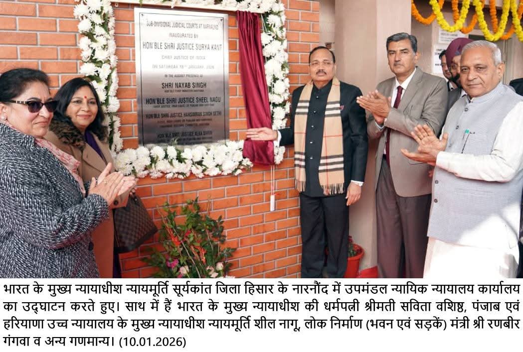 मुख्य न्यायाधीश न्यायमूर्ति सूर्यकांत नारनौंद स्थित उपमंडलीय न्यायिक परिसर में उपमंडल न्यायालय के विधिवत शुभारंभ एवं प्रस्तावित उपमंडलीय न्यायिक परिसर के शिलान्यास के उपरांत न्यायिक अधिकारियों, अधिवक्ताओं तथा गणमान्य नागरिकों को बतौर मुख्य अतिथि संबोधित कर रहे थे। उन्होंने कहा कि नारनौंद में उपमंडलीय न्यायालय की स्थापना क्षेत्र के लिए हर्ष का विषय है। न्यायपालिका का उद्देश्य न्याय को हर व्यक्ति, विशेषकर गरीब और वंचित वर्ग के द्वार तक पहुंचाना है। संविधान सभी नागरिकों को समान रूप से न्याय पाने का अधिकार देता है और इसी भावना के अनुरूप न्यायिक व्यवस्था को मजबूत किया जा रहा है।