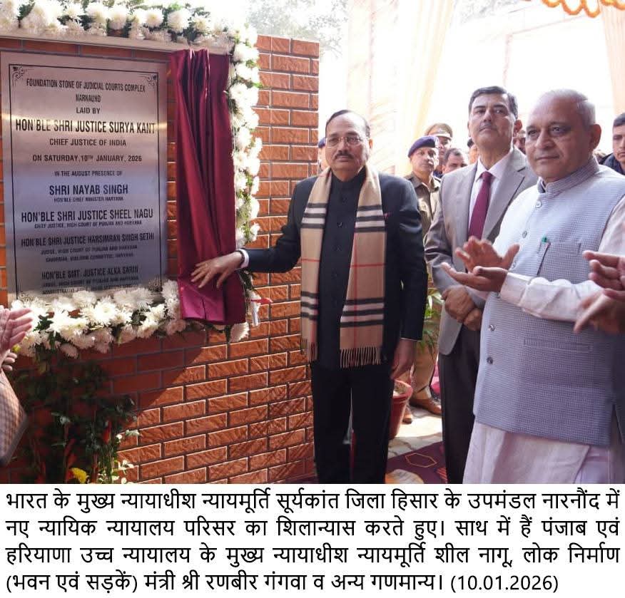 हरियाणा के जिला हांसी के उपमंडल नारनौंद में 21 करोड़ की लागत से बनेगा हाईटेक न्यायिक परिसर। सीजेआई ने वकीलों को दी नसीहत- तकनीकी ज्ञान से खुद को रखें अपडेट। 10 जनवरी 2026 को भारत के माननीय मुख्य न्यायाधीश न्यायमूर्ति सूर्यकांत ने घोषणा की कि हांसी में शीघ्र ही सेशन डिवीजन की स्थापना की जाएगी। हांसी को प्रदेश का 23वां जिला बनाए जाने के बाद यह कदम क्षेत्रवासियों के लिए एक महत्वपूर्ण उपलब्धि होगा और आमजन तक त्वरित एवं सुलभ न्याय पहुंचाने की दिशा में मील का पत्थर सिद्ध होगा।