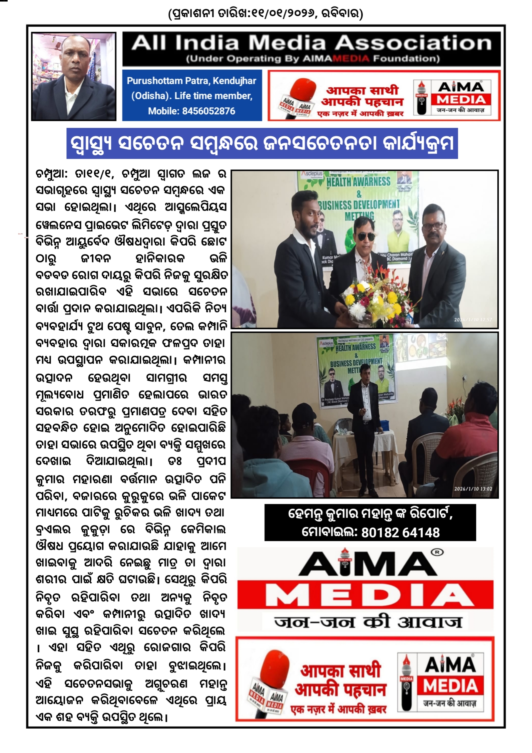 ଚମ୍ପୁଆ ତା୧୧/୧(ହେମନ୍ତ କୁମାର ମହାନ୍ତ) ଚମ୍ପୁଆ ସ୍ଵାଗତ ଲଜ ର ସଭାଗୃହରେ ସ୍ୱାସ୍ଥ୍ୟ ସଚେତନ ସମ୍ବନ୍ଧରେ ଏକ ସଭା ହୋଇଥିଲା । ଏଥିରେ ଆସ୍କଲେପିୟସ ୱେଲନେସ ପ୍ରାଇଭେଟ ଲିମିଟେଡ଼ ଦ୍ଵାରା ପ୍ରସ୍ତୁତ ବିଭିନ୍ନ ଆୟୁର୍ବେଦ ଔଷଧଦ୍ୱାରା କିପରି ଛୋଟ ଠାରୁ ଜୀବନ ହାନିକାରକ ଭଳି ବଡବଡ ରୋଗ ଦାୟରୁ କିପରି ନିଜକୁ ସୁରକ୍ଷିତ ରଖାଯାଇପାରିବ ଏହି ସଭାରେ ସଚେତନ ବାର୍ତ୍ତା ପ୍ରଦାନ କରାଯାଇଥିଲା। ଏପରିକି ନିତ୍ୟ ବ୍ୟବହାର୍ଯ୍ୟ ଟୁଥ ପେଷ୍ଟ ସାବୁନ, ତେଲ କମ୍ପାନି ବ୍ୟବହାର ଦ୍ଵାରା ସକାରତ୍ମକ ଫଳପ୍ରଦ ତାହା ମଧ୍ୟ ଉପସ୍ଥାପନ କରାଯାଇଥିଲା। କମ୍ପାନୀର ଉତ୍ପାଦନ ହେଉଥିବା ସାମଗ୍ରୀର ସମସ୍ତ ମୂଲ୍ୟବୋଧ ପ୍ରମାଣିତ ହେଲାପରେ ଭାରତ ସରକାର ତରଫରୁ ପ୍ରମାଣପତ୍ର ଦେବା ସହିତ ସହବନ୍ଧିତ ହୋଇ ଅନୁମୋଦିତ ହୋଇପାରିଛି ତାହା ସଭାରେ ଉପସ୍ଥିତ ଥିବା ବ୍ୟକ୍ତି ସମ୍ମୁଖରେ ଦେଖାଇ ଦିଆଯାଇଥିଲା। ଡଃ ପ୍ରଦୀପ କୁମାର ମହାରଣା ବର୍ତ୍ତମାନ ଉତ୍ପାଦିତ ପନି ପରିବା, ବଜାରରେ କୁରୁକୁରେ ଭଳି ପାକେଟ ମାଧ୍ୟମରେ ପାଟିକୁ ରୁଚିକର ଭଳି ଖାଦ୍ୟ ତଥା ବ୍ରଏଲର କୁକୁଡ଼ା ରେ ବିଭିନ୍ନ କେମିକାଲ ଔଷଧ ପ୍ରୟୋଗ କରାଯାଉଛି ଯାହାକୁ ଆମେ ଖାଇବାକୁ ଆଦରି ନେଇଛୁ ମାତ୍ର ତା ଦ୍ଵାରା ଶରୀର ପାଇଁ କ୍ଷତି ଘଟାଉଛି। ସେଥିରୁ କିପରି ନିବୃତ ରହିପାରିବା ତଥା ଅନ୍ୟକୁ ନିବୃତ କରିବା ଏବଂ କମ୍ପାନୀରୁ ଉତ୍ପାଦିତ ଖାଦ୍ୟ ଖାଇ ସୁସ୍ଥ ରହିପାରିବା ସଚେତନ କରିଥିଲେ । ଏହା ସହିତ ଏଥିରୁ ରୋଜଗାର କିପରି ନିଜକୁ କରିପାରିବା ତାହା ବୁଝାଇଥିଲେ। ଏହି ସଚେତନସଭାକୁ ଅଗ୍ନୁଚରଣ ମହାନ୍ତ ଆୟୋଜନ କରିଥିବାବେଳେ ଏଥିରେ ପ୍ରାୟ ଏକ ଶହ ବ୍ୟକ୍ତି ଉପସ୍ଥିତ ଥିଲେ ।