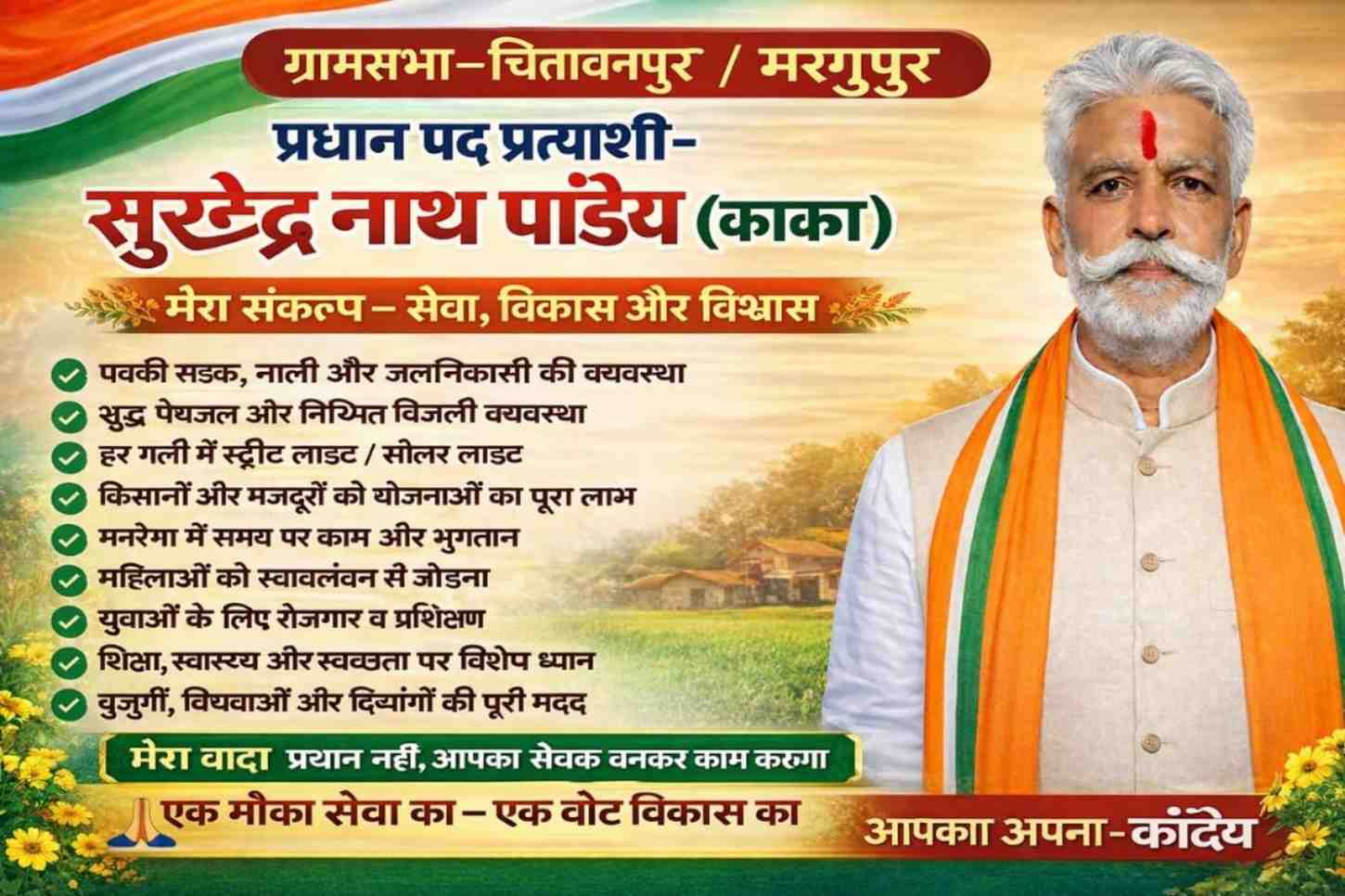 सुरेंद्रनाथ पांडे ने स्पष्ट कहा कि उनका उद्देश्य केवल पद प्राप्त करना नहीं, बल्कि प्रधान नहीं बल्कि जनता का सेवक बनकर काम करना है। उन्होंने जनता से अपील की कि एक अवसर सेवा का और एक वोट विकास का देकर ग्रामसभा को प्रगति की राह पर आगे बढ़ाने में सहयोग करें।
