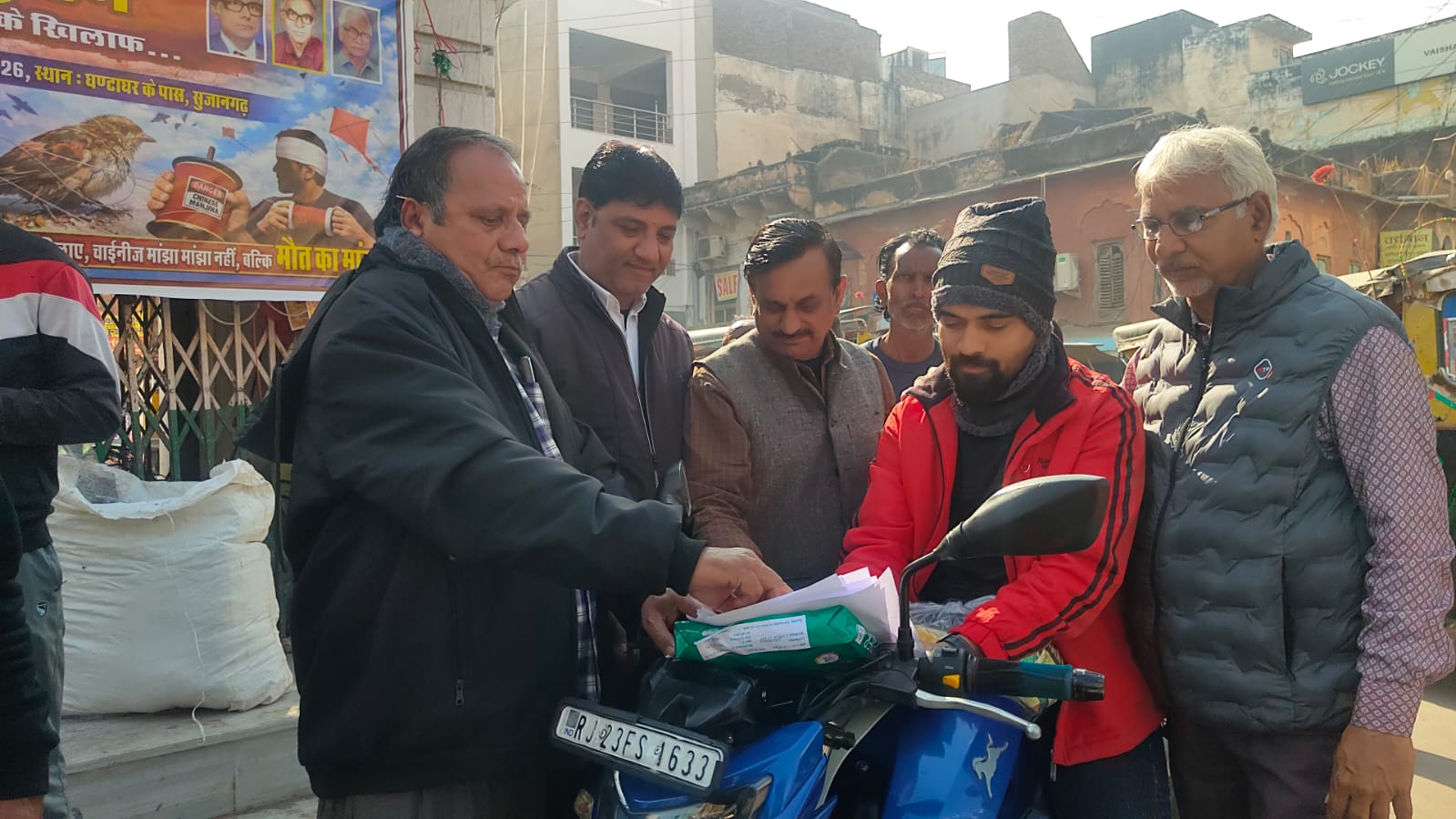 सुजानगढ़: चाइनीज मांझे के खिलाफ "एक मुहिम" में स्व. श्री जुगलकिशोर जी, स्व. श्री नंदकिशोर जी एवं स्व. श्री ताराचंद जी माटोलिया की पुण्य स्मृति में माटोलिया परिवार द्वारा सोमवार को एक जागरूकता अभियान चलाया गया। जिसमें बाइक एवं स्कूटी सवार लोगों को चाइनीज मांझे से बचाव के लिए गले में मफलर कैप पहनाई गई एवं नॉर्मल मांझा से पतंग उड़ाने की शपथ दिलवाई गई। नेताप्रतिपक्ष जयश्री दाधीच ने माटोलिया परिवार की सराहना करते हुए लोगों से चाइनीज मांझा उपयोग ना करने की सलाह दी। सेवा निवृत प्रधानाचार्य परमानंद मिश्रा ने शपथ पत्र का वाचन करते हुए लोगों को नॉर्मल मांझे का प्रयोग करने की शपथ दिलाई। अशोक माटोलिया ने बताया कि टीम अर्पिता शर्मा ने हमारे परिवार को इस जानलेवा मांझे से लोगों के हताहत होने और इस मुहिम में सहयोग करने की बात कही। टीम अर्पिता शर्मा की प्रेरणा से हमारे परिवार ने इस पुनीत कार्य में बढ़ चढ़ कर हिस्सा लिया।
