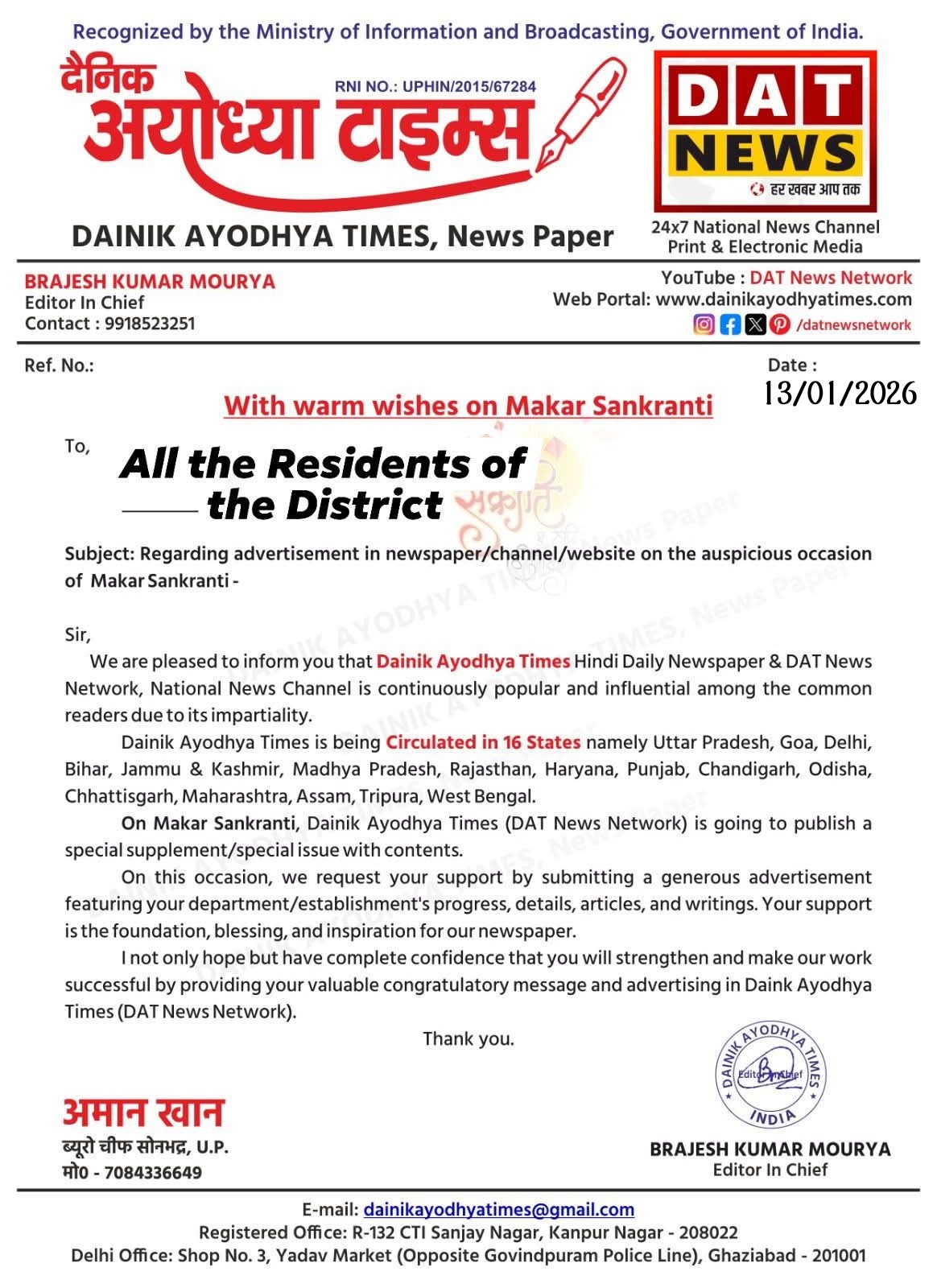 рджреИрдирд┐рдХ рдЕрдпреЛрдзреНрдпрд╛ рдЯрд╛рдЗрдореНрд╕ рдФрд░ DAT рдиреНрдпреВрдЬрд╝ рдиреЗрдЯрд╡рд░реНрдХ рдордХрд░ рд╕рдВрдХреНрд░рд╛рдВрддрд┐ рдХреЗ рд╢реБрдн рдЕрд╡рд╕рд░ рдкрд░ рдПрдХ "рд╡рд┐рд╢реЗрд╖ рд╡рд┐рд╢реЗрд╖рд╛рдВрдХ" рдкреНрд░рдХрд╛рд╢рд┐рдд рдХрд░рдиреЗ рдЬрд╛ рд░рд╣рд╛ рд╣реИред