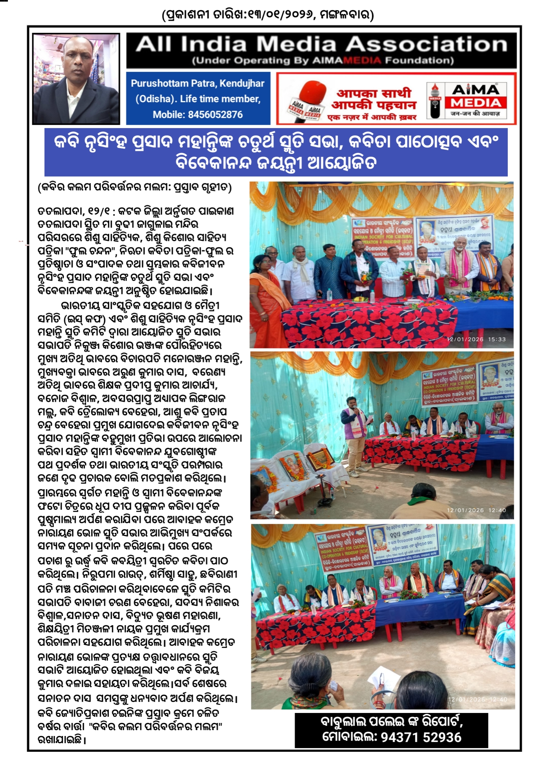 *କବି ନୃସିଂହ ପ୍ରସାଦ ମହାନ୍ତିଙ୍କ ଚତୁର୍ଥ ସ୍ମୃତି ସଭା, କବିତା ପାଠୋତ୍ସବ ଏବଂ ବିବେକାନନ୍ଦ ଜୟନ୍ତୀ ଆୟୋଜିତ*
