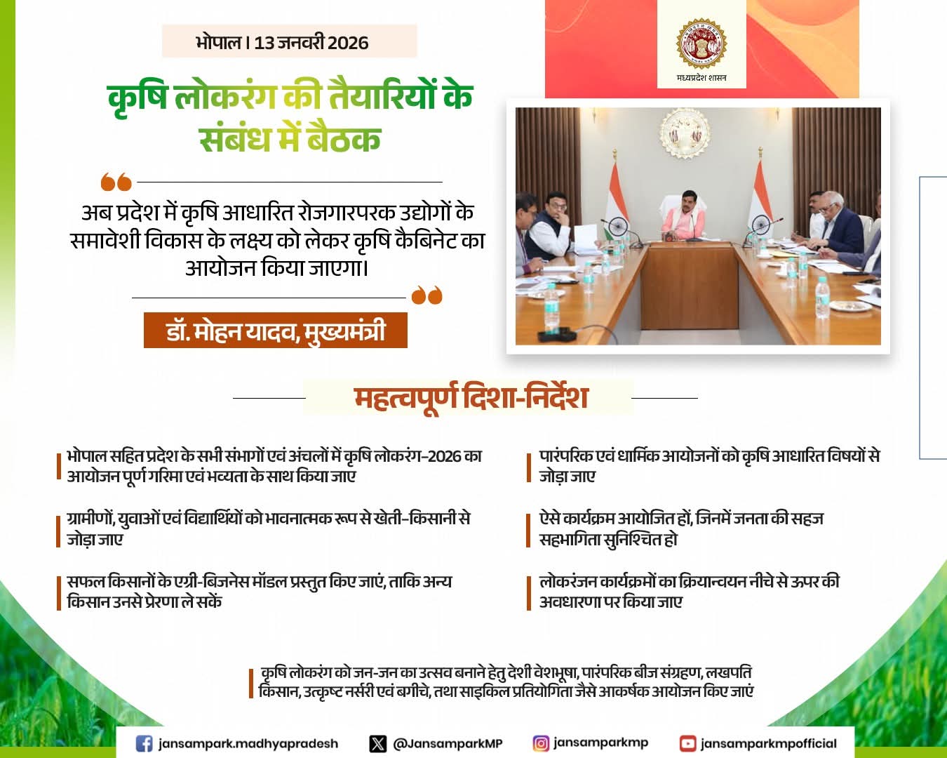 ➡️भोपाल सहित प्रदेश के सभी संभागों एवं अंचलों में कृषि लोकरंग–2026 का आयोजन पूर्ण गरिमा एवं भव्यता के साथ किया जाए