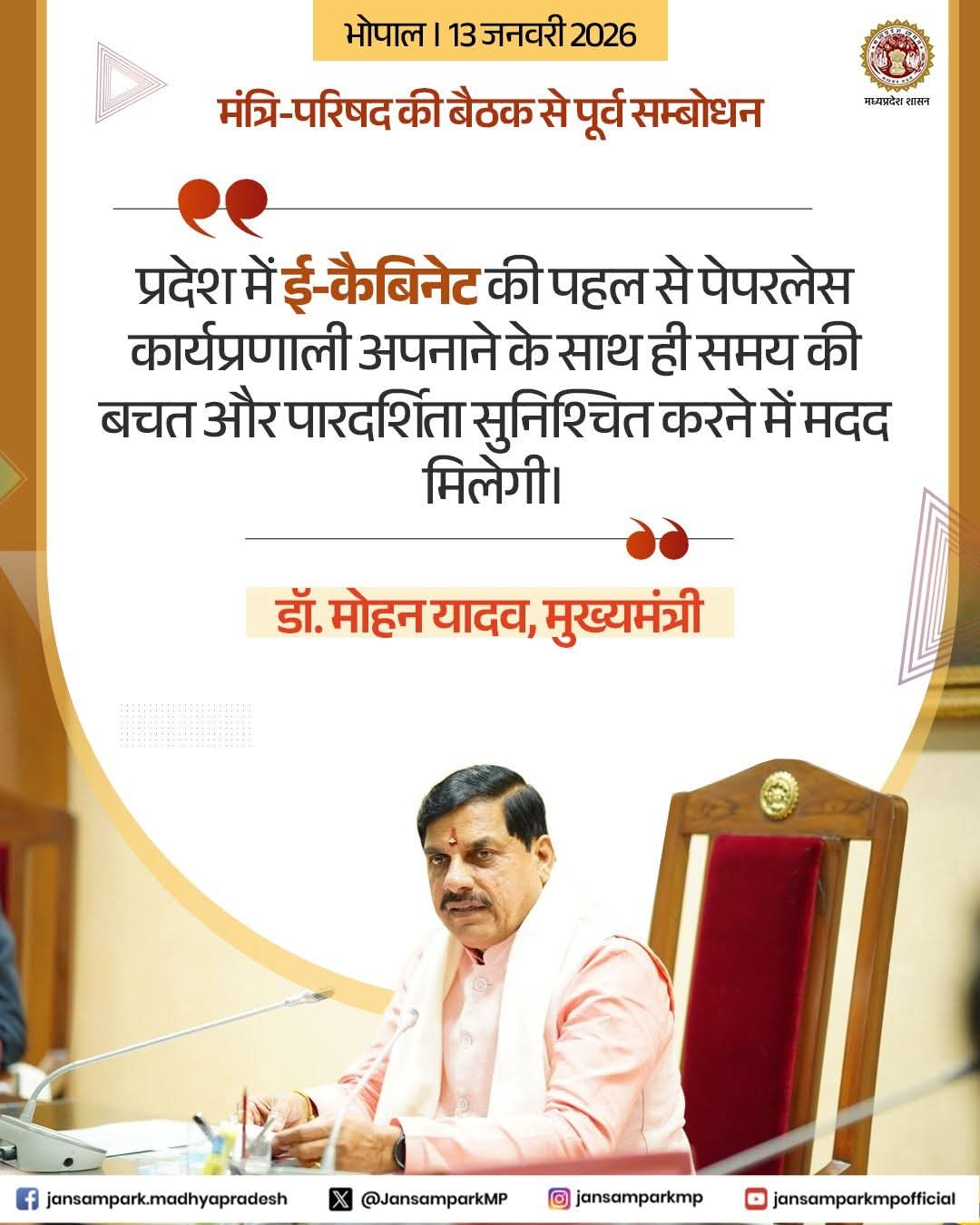 मध्यप्रदेश में ई -कैबिनेट की पहल से पेपरलेस कार्यप्रणाली अपनाने के साथ ही समय की बचत और पारदर्शिता सुनिश्चित करने में मदद मिलेगी।