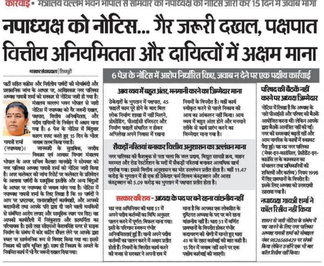 नगर पालिका अध्यक्ष को नोटिस गैर जरूरी दखल और वित्तीय अन्यथाओं के लिए नोटिस दिया गया है