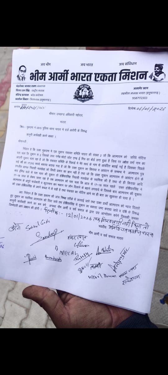 भीम आर्मी भारत एकता मिशन ईकाई भादरा ने उपखंड अधिकारी को सौंपा ज्ञापन विनोद खन्ना भादरा गत सोमवार को भीम आर्मी भारत एकता मिशन ईकाई ने भादरा उपखंड अधिकारी को ज्ञापन सौंपा। ज्ञापन में बताया गया कि निकटवर्ती ग्राम मलखेड़ा निवासी आत्माराम धाणक की दुकान दबाने के मामले ने पकड़ा तूल मुकदमा नं 0515 में दर्ज आरोपी को गिरफ्तार करने की मांग उक्त मुकदमा में एक दुकान पंचायत समिति भादरा की संख्या 2 जो की आत्माराम धानक को जरीये नोटिस पता चला कि दुकान संख्या दो जिसके ऊपर गणेश फोटो स्टेट एंड ई मित्र का बोर्ड लगा हुआ है जिस पर अशोक वर्मा नाम का आदमी दुकान चल रहा है जो की पंचायत समिति के रिकॉर्ड में आत्माराम स्वयं के नाम से आवंटित बताई गई है जिसे पिछले कई वर्षों का 17510 रूपए बताया गया है जो कि उक्त दुकान का किराया वह आवंटन के संबंध में आत्माराम पुत्र रणजीत धानक के निवासी मलखेड़ा को किसी प्रकार का ज्ञान नहीं है तथा जो कि उक्त दुकान आत्माराम के आवंटन के बाद ई मित्र वाले से पता चला की दुकान तो होशियार सिंह निवासी मलखेड़ा के स्वामीत्व की है तथा वही किराया आदि 17 18 साल से लेकर जाता रहा है जब आत्मा राम को पता चला कि आज से 17 18 साल पहले उक्त होशियार सिंह ने आत्माराम के अंगूठे फर्जकारी वह कूटरचना कर मकान पर लोन दिलाने के बहाने लगवाए थे जिसके बाद आत्माराम की दुकान को उक्त होशियार सिंह पुनिया ने अपने कब्जे में ले रखी है तथा पंचायत का नोटिस आने पर ही बात का खुलासा हो पाया है पीड़ित का निवेदन है कि उक्त प्रकरण की जांच निष्पक्ष तरीके से करवाई जावे तथा उक्त प्रार्थी आत्माराम धाणका को न्याय दिलाते हुए दुकान का स्वामीत्व आत्माराम को दिया जाए तथा होशियार सिंह पुनिया से दुकान का बकाया जमा कराया जावे वह दोषी के विरोध कानूनी कार्यवाही करने का श्रम करें 12 जनवरी 2026 तक गिरफ्तारी नहीं हुई तो अनिश्चितकालीन धरना लगाया जाएगा इस मौके पर अजीत भारतीय मोहर सिंह भाटिया विनोद कुमार सतवीर आत्माराम शंकर लाल शकील गोरी संदीप राकेश होटला राधेश्याम संजय जाण्ड सुरेश आदि मौजूद रहे