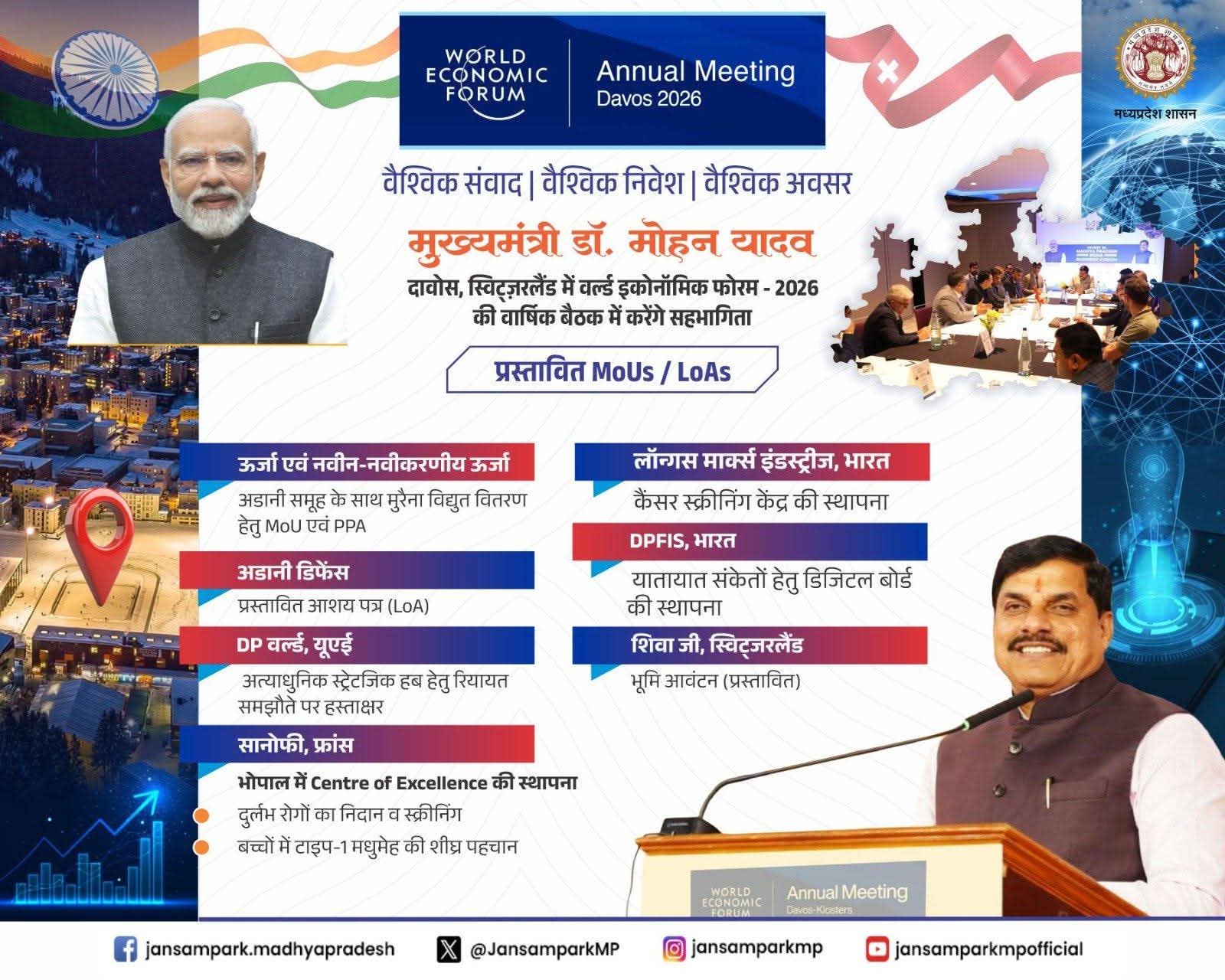 मुख्यमंत्री डॉ. मोहन यादव स्विट्जरलैंड के दावोस में आयोजित वर्ल्ड इकोनॉमिक फोरम 2026 की वार्षिक बैठक में करेंगे सहभागिता