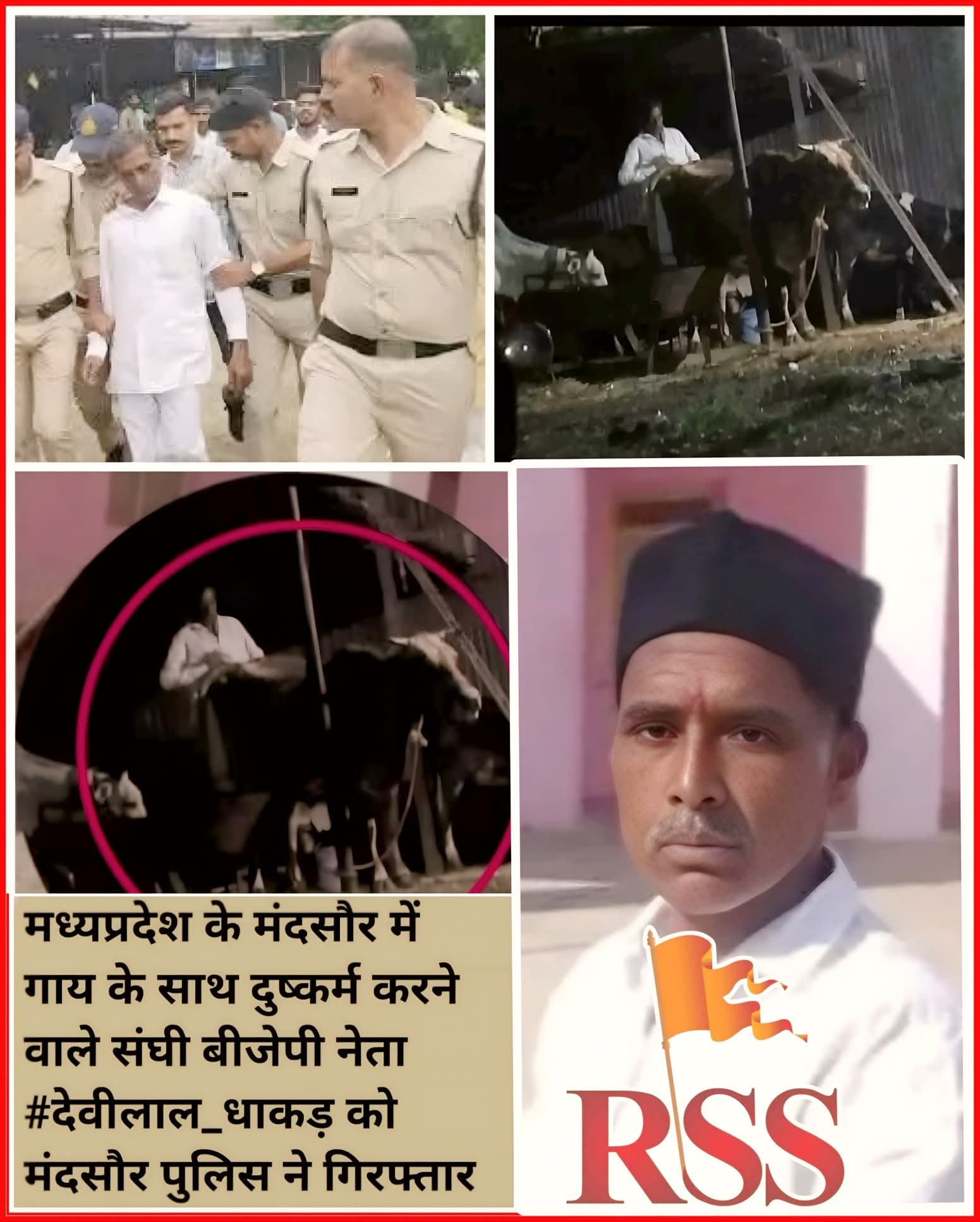 मध्यप्रदेश के मंदसौर में गाय के साथ दुष्कर्म करने वाले संघी #बीजेपी नेता #देवीलाल_धाकड़ को मंदसौर पुलिस ने गिरफ्तार कर लिया।।