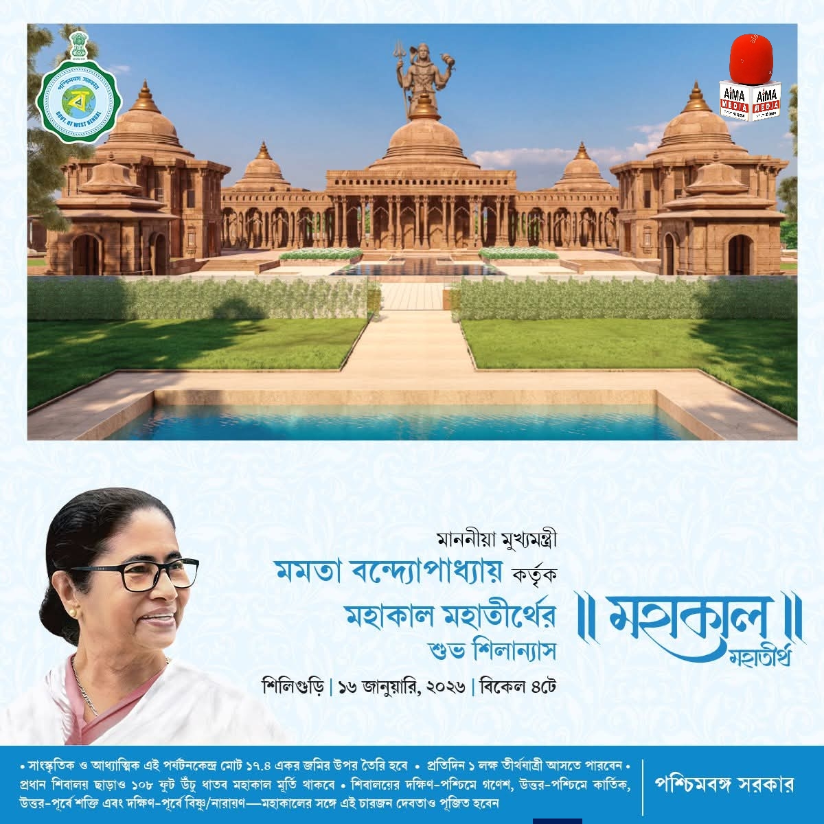 ১৬ জানুয়ারি, ২০২৬, শুক্রবার বিকেল ৪টেয় মাননীয়া মুখ্যমন্ত্রী মমতা বন্দ্যোপাধ্যায় শিলিগুড়িতে মহাকাল মহাতীর্থের শুভ শিলান্যাস করবেন।