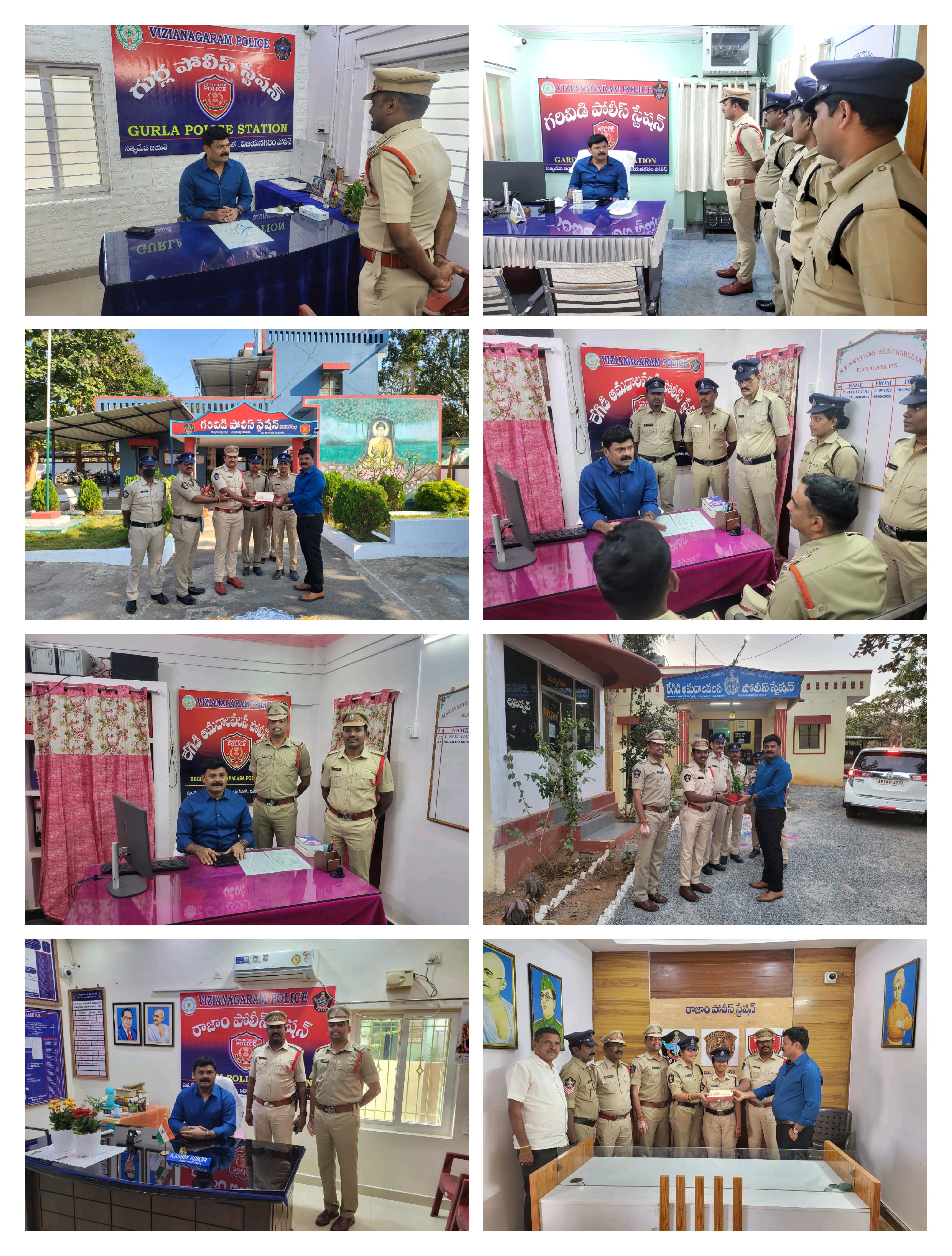 విజయనగరం జిల్లాలోని గుర్ల, గరివిడి, రాజాం మరియు రేగిడి ఆముదాలవలస పోలీసు స్టేషన్లను జిల్లా ఎస్పీ ఎ.ఆర్.దామోదర్ జనవరి 16న సందర్శించి, పోలీసు స్టేషను ప్రాంగణాలను పరిశీలించారు. అనంతరం అందుబాటులో ఉన్న పోలీసు అధికారులు మరియు సిబ్బందికి మిఠాయిలను ఎస్పీ స్వయంగా అందజేశారు.