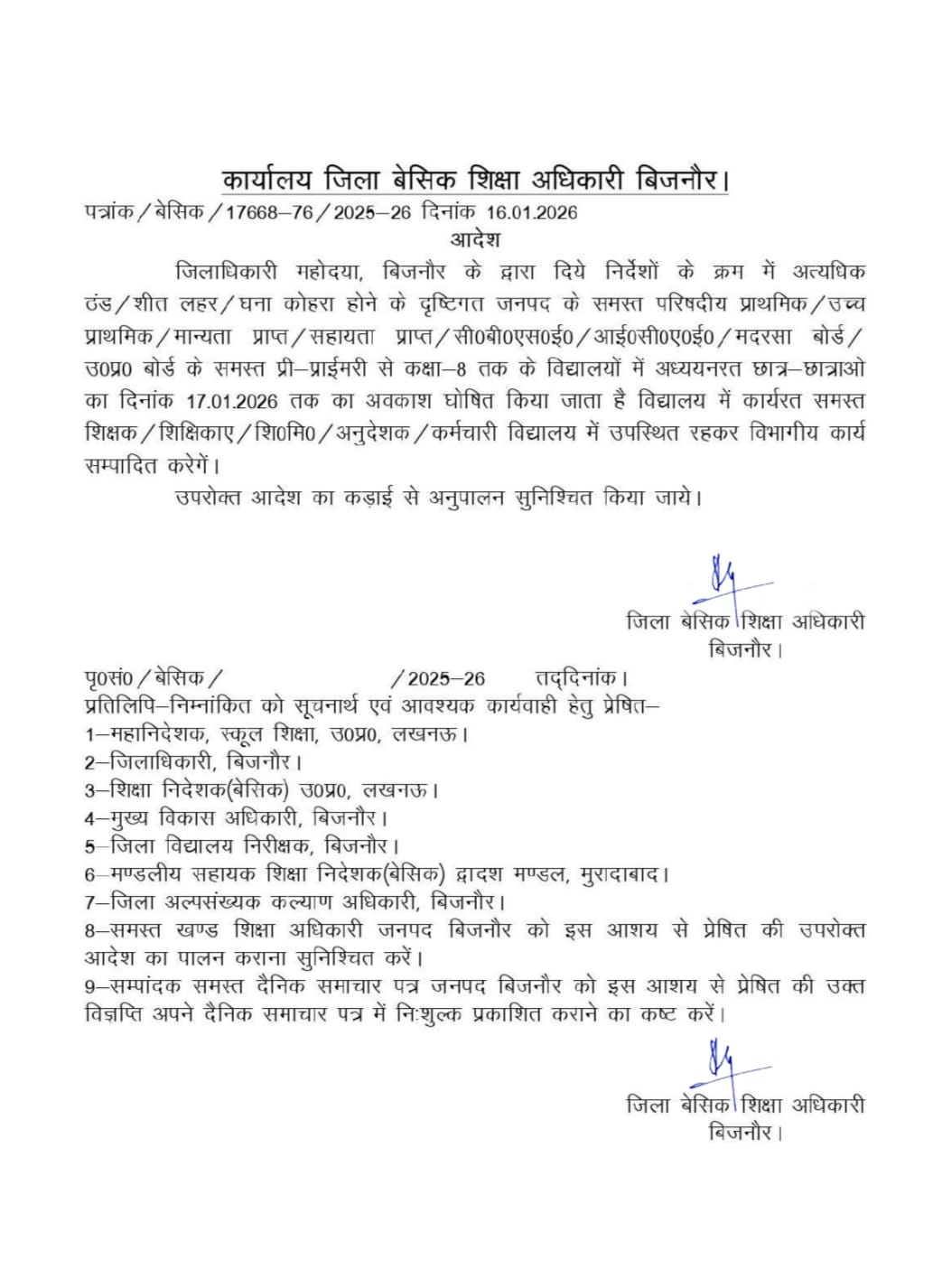 जिलाधिकारी महोदया, बिजनौर के द्वारा दिये निर्देशों के क्रम में अत्यधिक ठंड/शीत लहर/घना कोहरा होने के दृष्टिगत जनपद के समस्त परिषदीय प्राथमिक/उच्च प्राथमिक / मान्यता प्राप्त/सहायता प्राप्त / सी बी एस सी / आई सी एस सी/ मदरसा बोर्ड /उत्तर प्रदेश बोर्ड के समस्त प्री प्राईमरी से कक्षा 8 तक के विद्यालयों में अध्ययनरत छात्र-छात्राओ का दिनांक 17 जनवरी का अवकाश घोषित किया जाता है विद्यालय में कार्यरत समस्त शिक्षक/शिक्षिकाए/शिक्षा मित्र / अनुदेशक / कर्मचारी विद्यालय में उपस्थित रहकर विभागीय कार्य सम्पादित करेगें।