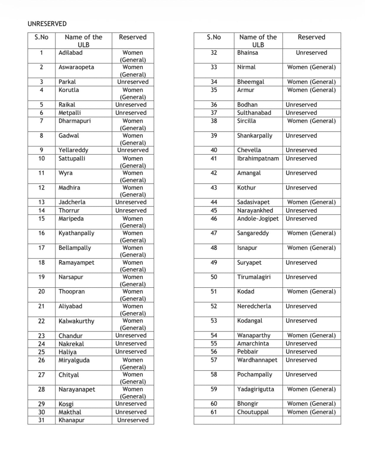 3.Greater warangal municipal Corporation (GWMC) - Unreserved.