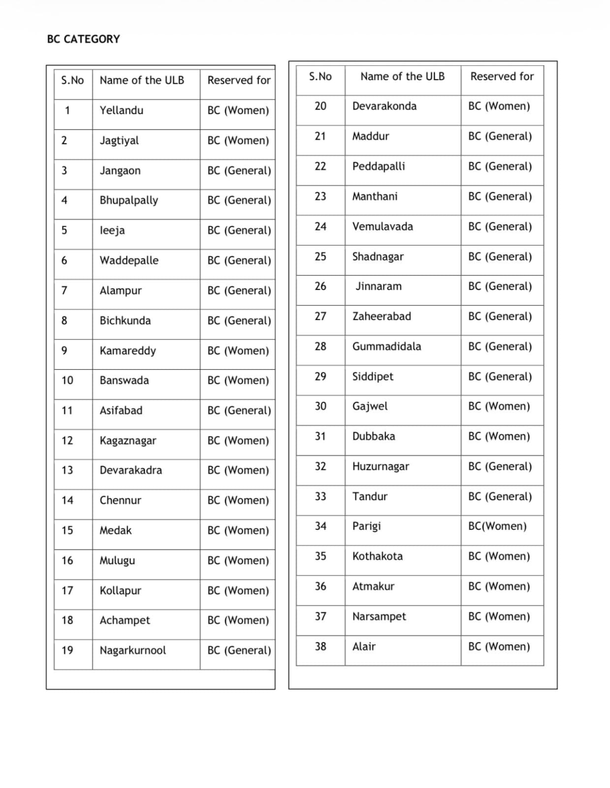 Thus,State government of Telanagana officially released and reservation categories for election.This are the total no. Of caste wise reservations of municipalities and municipal Corporation of telangana state.