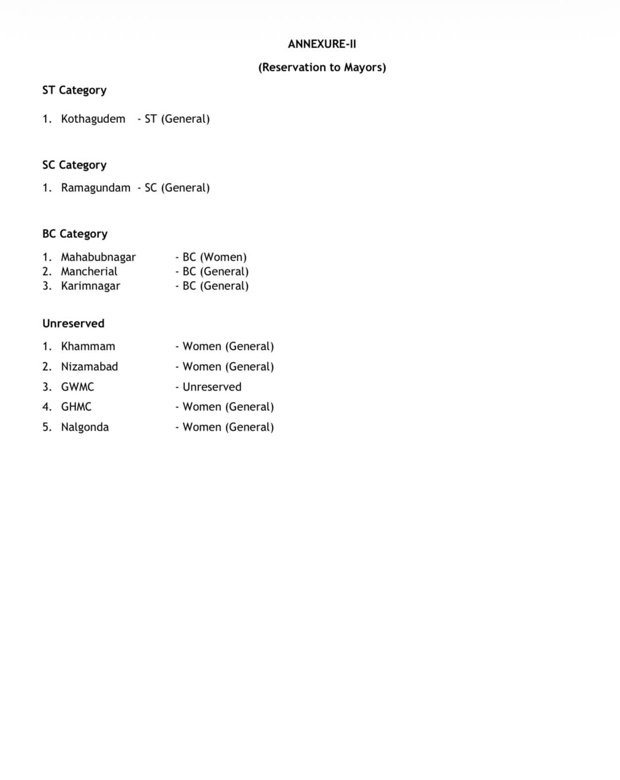 Reservation of municipalities & municipal corporation of telangana state by cast wise categories.