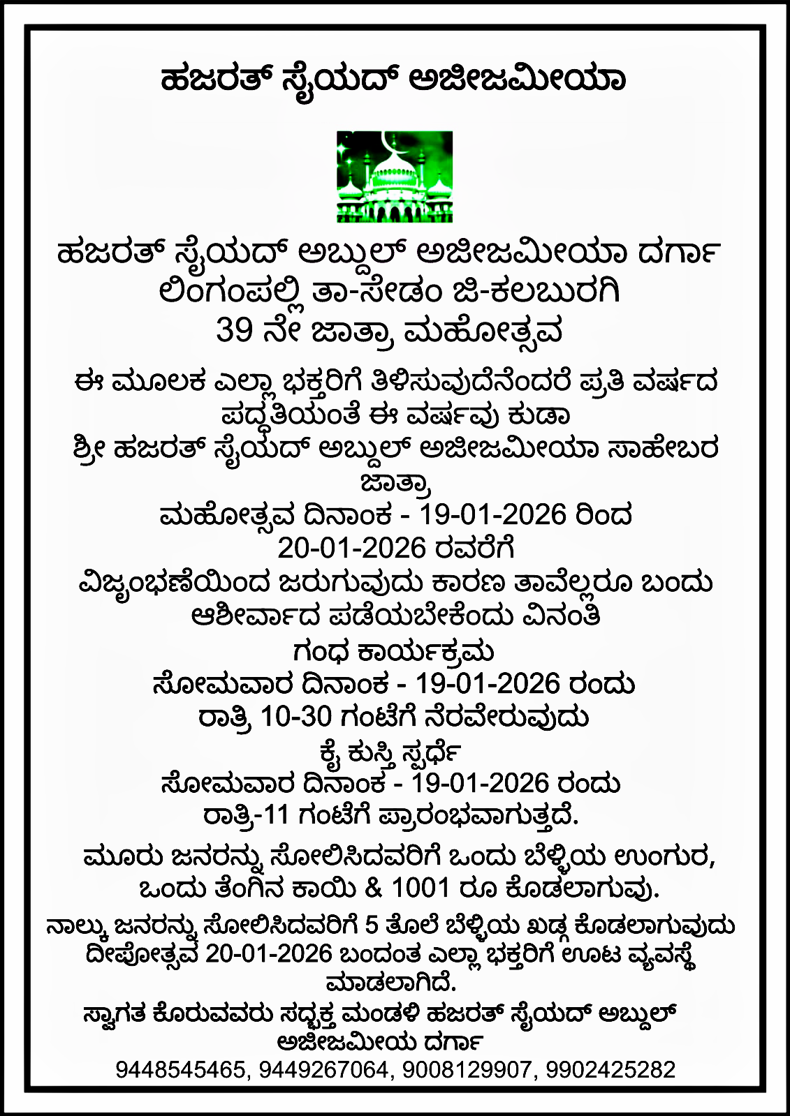 ಹಜರತ್ ಸೈಯದ್ ಅಬ್ದುಲ್ ಅಜೀಜಮೀಯಾ ದರ್ಗಾ ಲಿಂಗಂಪಲ್ಲಿ ತಾ-ಸೇಡಂ ಜಿ-ಕಲಬುರಗಿ 39 ನೇ ಜಾತ್ರಾ ಮಹೋತ್ಸವ ದಿನಾಂಕ 19-01-26.