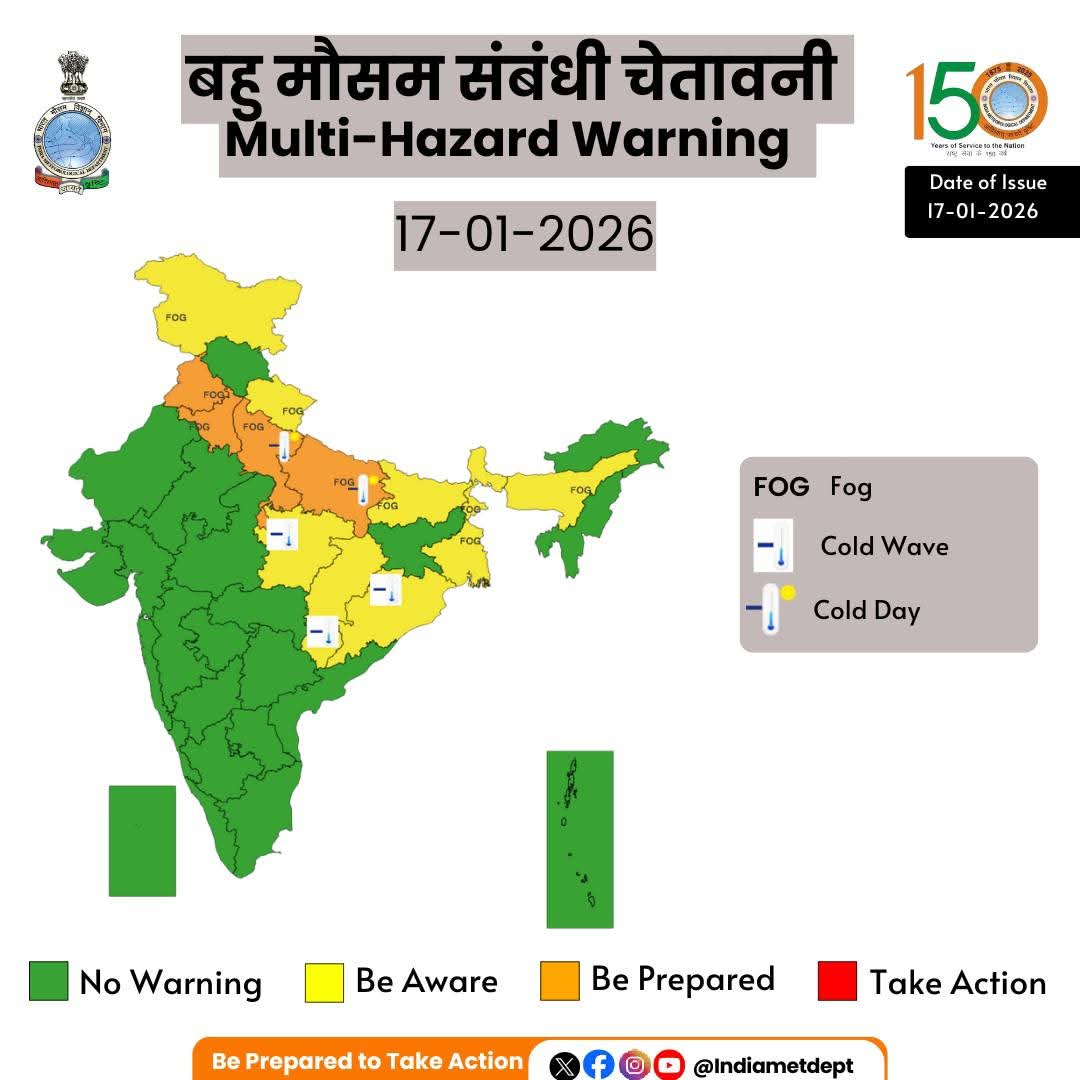 ❖ 17 तारीख को पश्चिमी उत्तर प्रदेश के अलग-अलग स्थानों पर ठंडे दिन की स्थिति रहने की संभावना है; 17 और 18 जनवरी को पूर्वी उत्तर प्रदेश में।