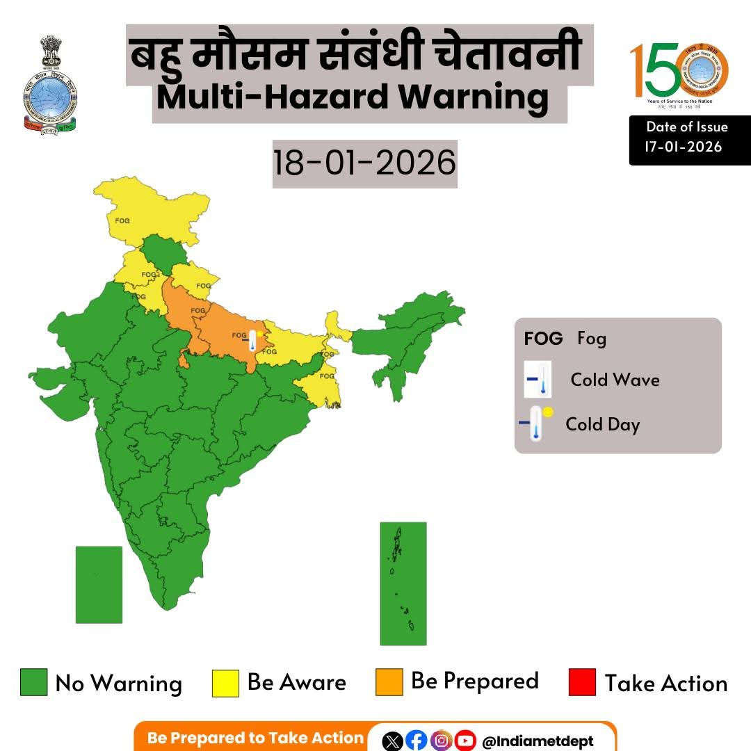 ❖ 18 तारीख तक पंजाब, हरियाणा और चंडीगढ़ के अलग-अलग/कुछ हिस्सों में सुबह/रात के घंटों में घने से बहुत घने कोहरे की स्थिति रहने की बहुत अधिक संभावना है और 22 जनवरी 2026 तक पंजाब, हरियाणा और चंडीगढ़ के अलग-अलग इलाकों में घना कोहरा रहेगा।