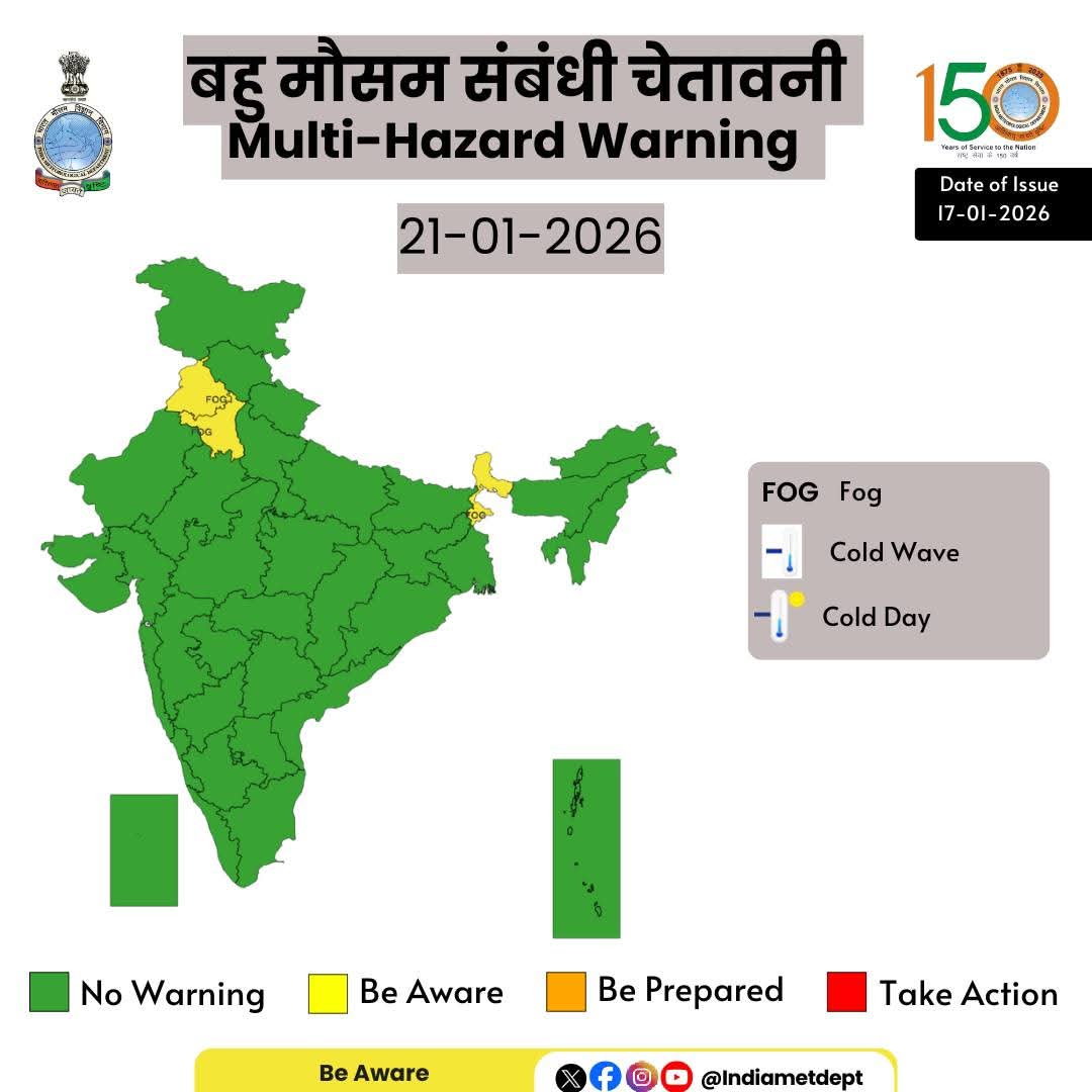 ❖ 19 तारीख तक जम्मू संभाग और उत्तराखंड के अलग-अलग/कुछ इलाकों में सुबह/रात के घंटों में घने कोहरे की स्थिति रहने की संभावना है; 23 तारीख तक उप-हिमालयी पश्चिम बंगाल और सिक्किम में; 19 तारीख तक गंगा के मैदानी पश्चिम बंगाल में; 21 तारीख तक बिहार में और 18 जनवरी तक असम और मेघालय में।