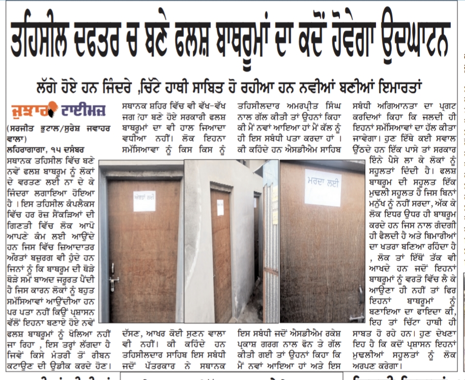 19 जनवरी: लहरागागा (सुरेश जवाहर वाला 90233-63132) जुझार टाइम्स अखबार में प्रमुखता से छपी खबर का तुरंत असर तब देखने को मिला जब SDM लहरा राकेश प्रकाश गर्ग के आदेश पर तहसील लहरा ऑफिस में बने बाथरूम आम जनता के लिए खोल दिए गए। बाथरूम लंबे समय से बंद होने की वजह से तहसील में काम करवाने आने वाले आम नागरिकों, बुजुर्गों और महिलाओं को भारी दिक्कतों का सामना करना पड़ रहा था।