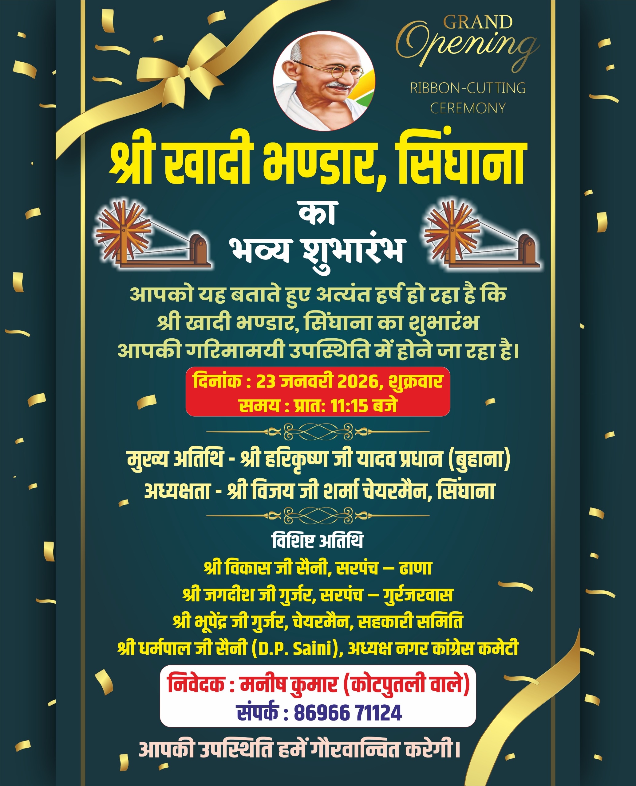 श्री खादी भंडार का भव्य शुभारंभ 23 जनवरी शुक्रवार को प्रातः 11:15 बजे सिंघाना में किया जाएगा। मनीष कुमार ने बताया कि कार्यक्रम में मुख्य अतिथि बुहाना प्रधान हरीकृष्ण यादव होंगे। कार्यक्रम की अध्यक्षता सिंघाना चेयरमैन विजय शर्मा करेंगे। विशिष्ट अतिथि ढाणा सरपंच विकास सैनी, गुर्जरवास सरपंच जगदीश गुर्जर, सहकारी समिति चेयरमैन भूपेन्द्र गुर्जर व नगर कांग्रेस कमेटी अध्यक्ष धर्मपाल सैनी होंगे।