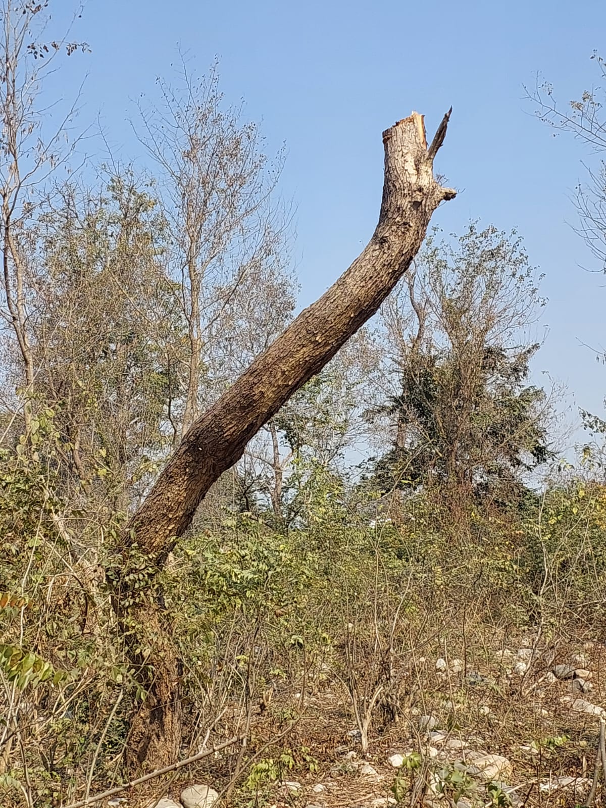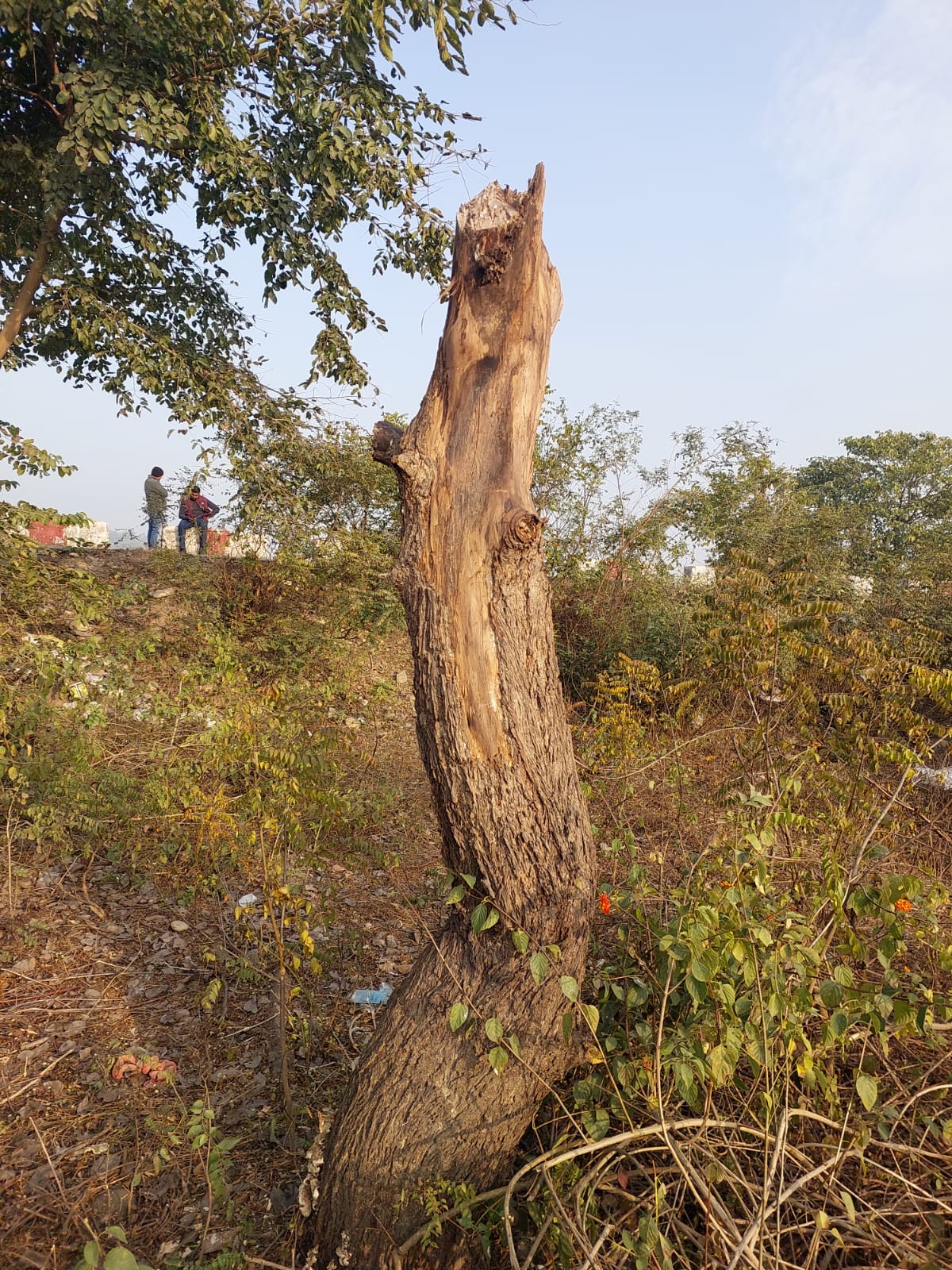 हालिया तस्वीरें इस प्रक्रिया की पूरी तस्वीर पेश करती हैं। एक तस्वीर में मजबूत शीशम पेड़ की लोपिंग (शाखाओं को बड़े पैमाने पर काटना) साफ नजर आ रही है — यह पेड़ को कमजोर करने का प्रारंभिक चरण है। दूसरी तस्वीर में उसी पेड़ का एक बड़ा हिस्सा पहले ही काट लिया गया दिख रहा है।