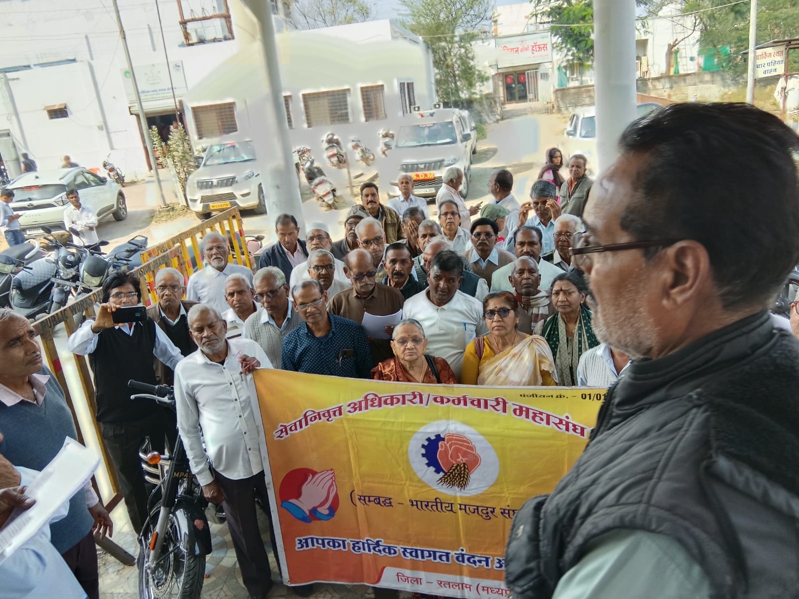 रतलाम:- मध्य प्रदेश अधिकारी कर्मचारी पेंशनर्स महासंघ भोपाल के आव्हान पर रतलाम जिला मुख्यालय पर आज दिनांक 21 जनवरी को पेंशनरों की 9 सूत्रीय मांगो के संबंध में मध्य प्रदेश के मुख्य मंत्री के नाम ज्ञापन जिला कलेक्ट्रेट रतलाम में ज्ञापन कलेक्टर के प्रतिनिधि को अपराह्न 12,.30 पर प्रेषित किया गया। ज्ञापन का वाचन संघ के जिलाध्यक्ष श्री रामेश्वर पाटीदार द्वारा किया गया ज्ञापन देते समय जिला उपाध्यक्ष राम प्रसाद धाकड़,जिला सचिव सुरेश पाठक, कोषाध्यक्ष शांति लाल शर्मा, प्रदेश कार्य समिति सदस्य श्री भंवर सिंह राठौड़, श्री मति लता बक्शी श्री मुकेश भारद्वाज, श्री बलराम जी, जगदीश प्रसाद उपाध्याय, किशोर सिंह पंवार, सोहन सिंह पंवार, नंदलाल शर्मा, भरत लाल चौधरी, राम प्रसाद धाकड़, अरुण दुबे आलोट, रामचंद्र शर्मा, घनश्याम भैंसोटा, राजेंद्र कुमार जो राठौड़शी हफीजुरहमान खान,रमेश चंद्र सोनगराअरुण कुमार दुबे ताल, नारायण सिंह राठौड़, कैलाश राठौड़ , चेतराम टांक, किशोर सिंह पंवार, भंवर लाल चौधरी, गेंदा लाल पाटीदार, प्रमोद पाठक, विनोद शर्मा, बापू सिंह राठौड़, मोती सिंह जी ईश्वर लाल सालवी सहित कई वरिष्ठ पेंशनर साथी उपस्थित थे । अंत में आभार