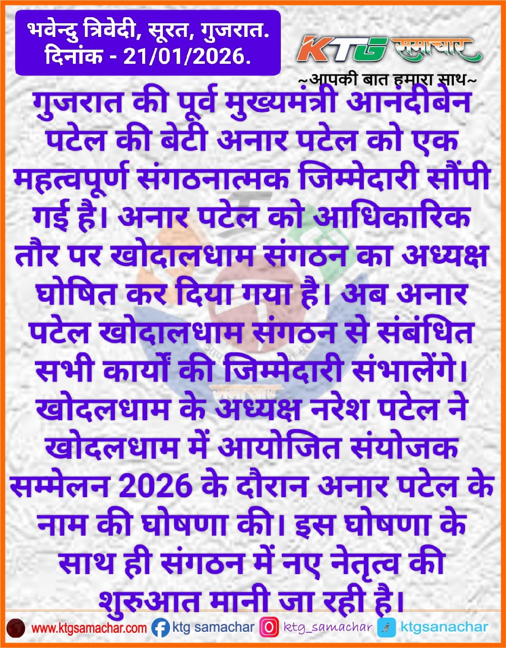 अनार पटेल को आधिकारिक तौर पर खोडलधाम संगठन का अध्यक्ष घोषित कर दिया गया है।