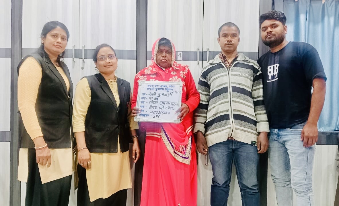 अपना घर आश्रम में सुनीता को आश्रय देकर उसकी नियमित चिकित्सा प्रारम्भ की गई ।सात साल के बाद उसकी मानसिक अवस्था में कुछ सुधार आने पर कॉन्सलिंग के दौरान सुनीता ने बताया कि वह पटना की रहने वाली है ।पटना थाने में उसका विवरण भेजने पर उसके गुमशुदगी की रिपोर्ट के माध्यम से पुलिस ने उनके परिजनों तक सुनीता के विषय में सूचना पहुंचाई ।अपना घर आश्रम की टीम द्वारा परिजनों की जानकारी मिलने पर उसके बेटे से माँ की बात कराई तो वह अपनी माँ को पहिचान गया और तुरंत अपने एक परिजन के साथ कोटा के लिए रवाना हो गया ।यहाँ आने पर लगभग तीस वर्षीय उसके पुत्र दीपक कुमार ने बताया कि वे दरोगा राय पथ पटना,बिहार के रहने वाले हैं ।मानसिक अस्वस्थ होने के कारण उसकी माँ 2011 में बिना बताए घर से लापता हो गई थी जिसकी रिपोर्ट भी पुलिस थाने में कराई और व्यक्तिगत रूप से भी हमने प्रयास किए ।अब पंद्रह वर्षों बाद पुलिस थाने द्वारा उनकी माँ के विषय में समाचार मिला कि वह कोटा अपना घर आश्रम में है तो पूरे परिवार को बहुत प्रसन्नता हुई ।यहाँ पहुँचने पर अपनी माँ को स्वस्थ देख कर हम सभी बहुत प्रसन्न हैं ।अपना घर आश्रम के इस नेक कार्य के लिए उन्होंने आभार प्रकट किया ।