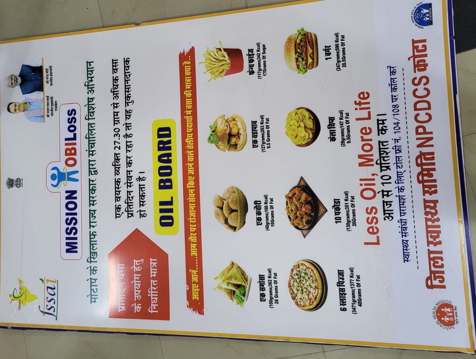 कोटा। मुख्य चिकित्सा एवं स्वास्थ्य अधिकारी (सीएमएचओ) कोटा डॉ. नरेंद्र नागर के मार्गदर्शन में, यूपीएचसी केशवपुरा में चिकित्सा अधिकारी डॉ. यावर खान द्वारा "मिशन ओबीआई लॉस" के बारे में एक जागरूकता सत्र आयोजित किया गया। यह अभियान भारत के राजस्थान राज्य में मोटापे से लड़ने और स्वस्थ खानपान को बढ़ावा देने पर केंद्रित है, जिसमें तेल के प्रति जागरूकता और कम चीनी के उपयोग पर विशेष जोर दिया गया है।