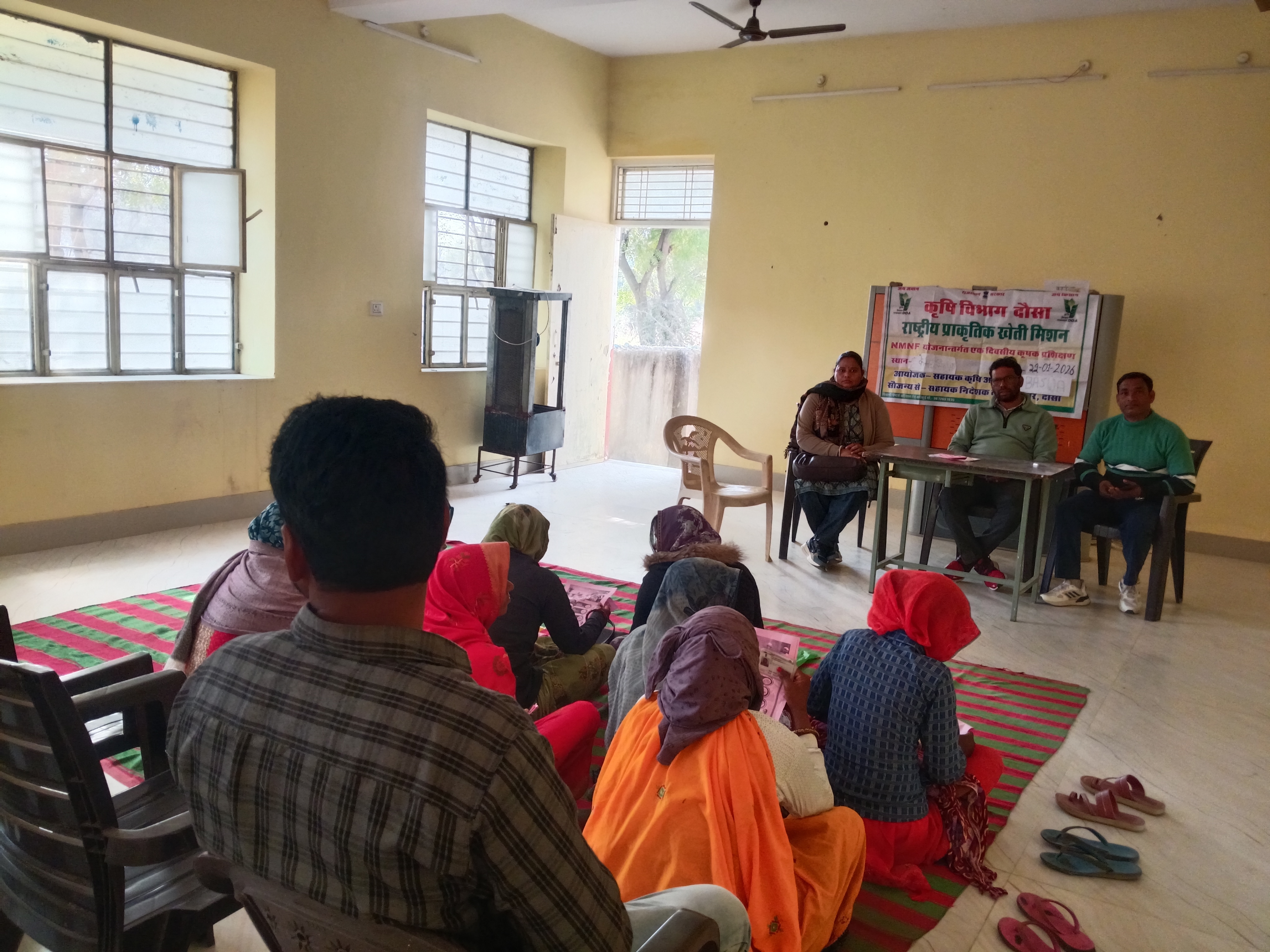 बसवा / सुमित कुमार बैरवा ।। कृषि विभाग राजस्थान सरकार के तत्वावधान में कृषि विज्ञान दौरा/कृषक प्रशिक्षण कार्यक्रम का आयोजन राष्ट्रीय प्राकृतिक खेती मिशन (NMNF) योजनान्तर्गत 22 जनवरी 2026 को ग्राम पंचायत केशरीसिंहपुरा (बसवा ) में किया गया। वरिष्ठ कृषि पर्यवेक्षक शबनम बाई बैरवा ने राष्ट्रीय प्राकृतिक खेती मिशन में ग्राम वासियों को जानकारी दी । इस कार्यक्रम का उद्देश्य किसानों को प्राकृतिक खेती की आधुनिक एवं टिकाऊ तकनीकों से अवगत कराना रहा। इस प्रशिक्षण में प्राकृतिक खेती के सिद्धांत, जैविक आदानों का उपयोग, मृदा स्वास्थ्य संरक्षण, फसल लागत में कमी तथा पर्यावरण अनुकूल खेती के लाभों पर विस्तार से जानकारी दी गई। उपस्थित किसानों को प्राकृतिक खेती अपनाने के लिए प्रेरित किया गया तथा उनके प्रश्नों का समाधान भी किया गया। इस अवसर पर ग्राम विकास अधिकारी सागर गोयला , कनिष्ठ सहायक सतीश कुमार बैरवा व निरंजन आदि मौजूद रहे