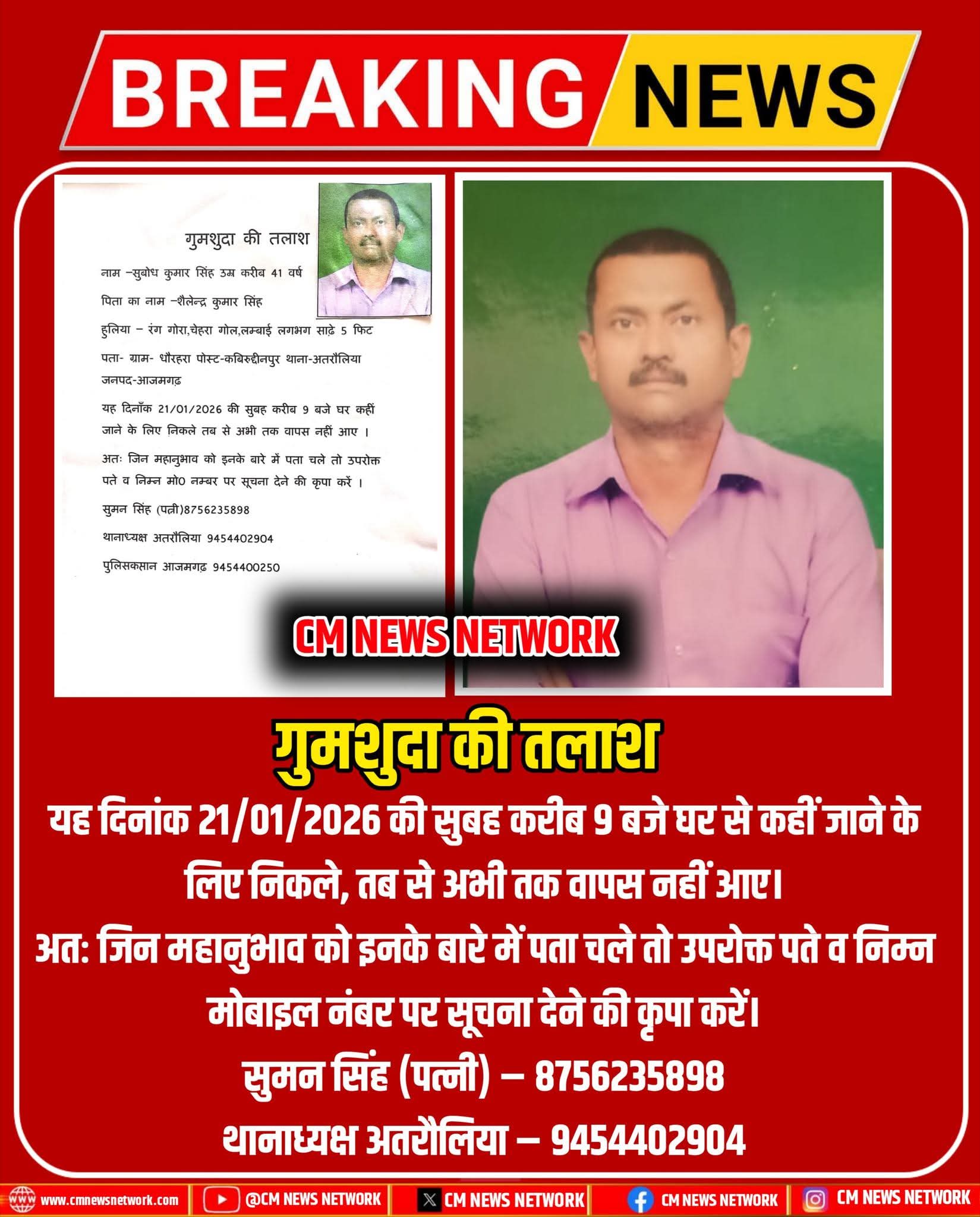 #गुमशुदा_की_तलाश आजमगढ़ यह दिनांक 21/01/2026 की सुबह करीब 9 बजे घर से कहीं जाने के लिए निकले, तब से अभी तक वापस नहीं आए।