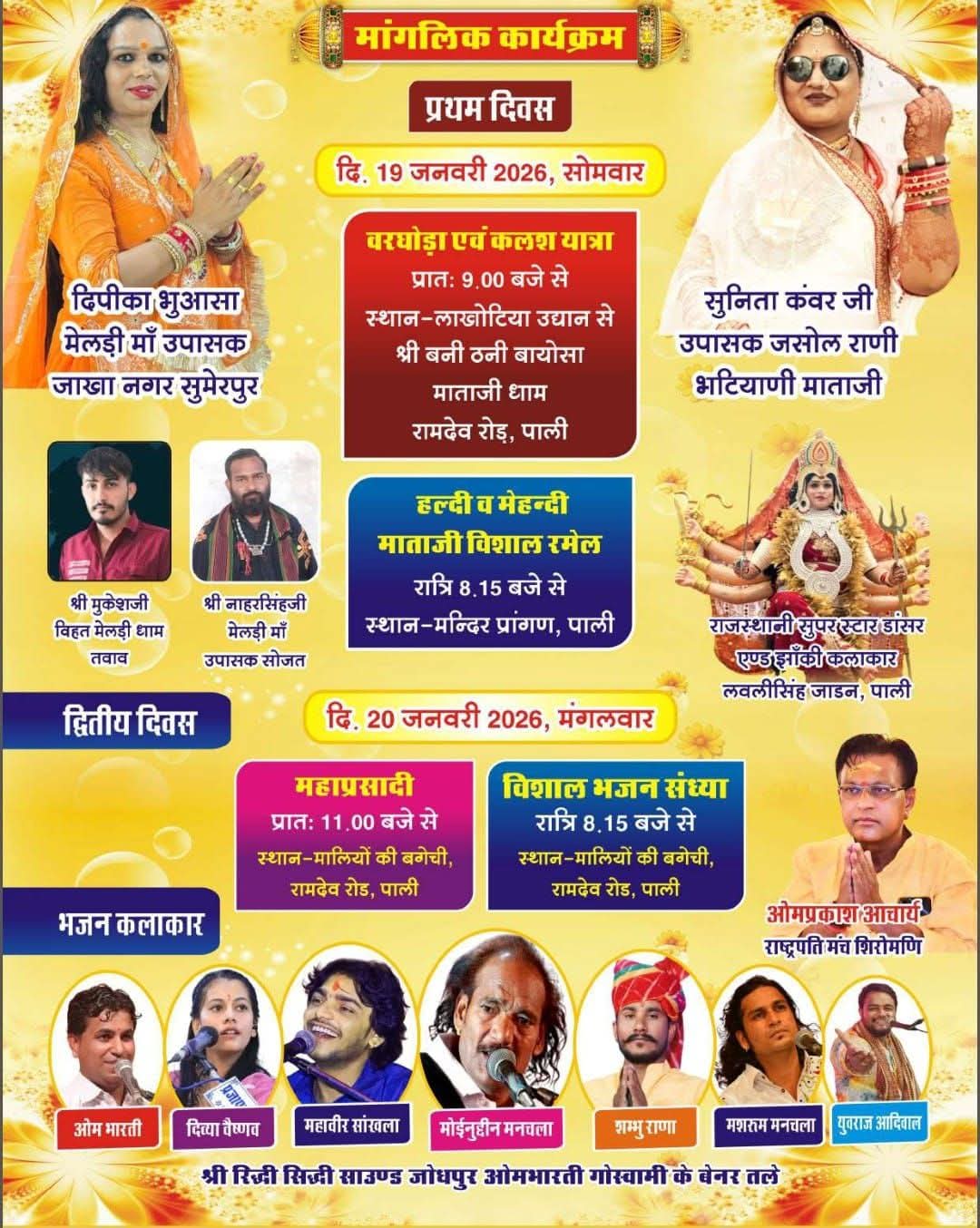 पाली (राजस्थान) में श्री बनी ठनी बायोरसा माताजी धाम, रामदेव रोड पर दो दिवसीय भव्य मांगलिक कार्यक्रम का आयोजन दिनांक 19 एवं 20 जनवरी 2026 को किया जा रहा है। इस धार्मिक आयोजन में माताजी के उपासकों, कलाकारों और श्रद्धालुओं की बड़ी संख्या में उपस्थिति रहेगी।