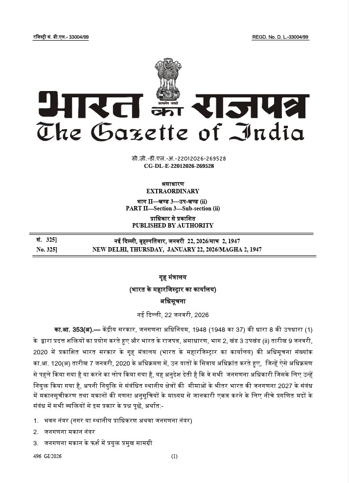 Census of India 2027 ke Phase I ke liye Houselisting & Housing Census ka questionnaire officially notify kar diya gaya hai. Is phase mein gharon aur housing se related details collect ki jayengi.