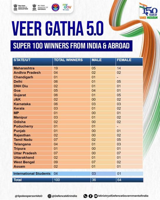 येत्या प्रजासत्ताक दिनानिमित्त आयोजित ‘प्रोजेक्ट वीर गाथा’ या राष्ट्रीय स्पर्धेचा निकाल जाहीर झाला आहे. त्यात देशातल्या ‘सुपर 100’ विजेत्यांमध्ये सर्वाधिक 19 विजेते महाराष्ट्राचे आहेत. या विजेत्यांमध्ये 14 मुलींचा समावेश आहे. त्यांनी चित्रकला, कविता, परिच्छेद लेखन आणि मल्टिमीडिया सादरीकरण अशा विविध क्षेत्रांत आपल्या कौशल्याचं दर्शन घडवलं.