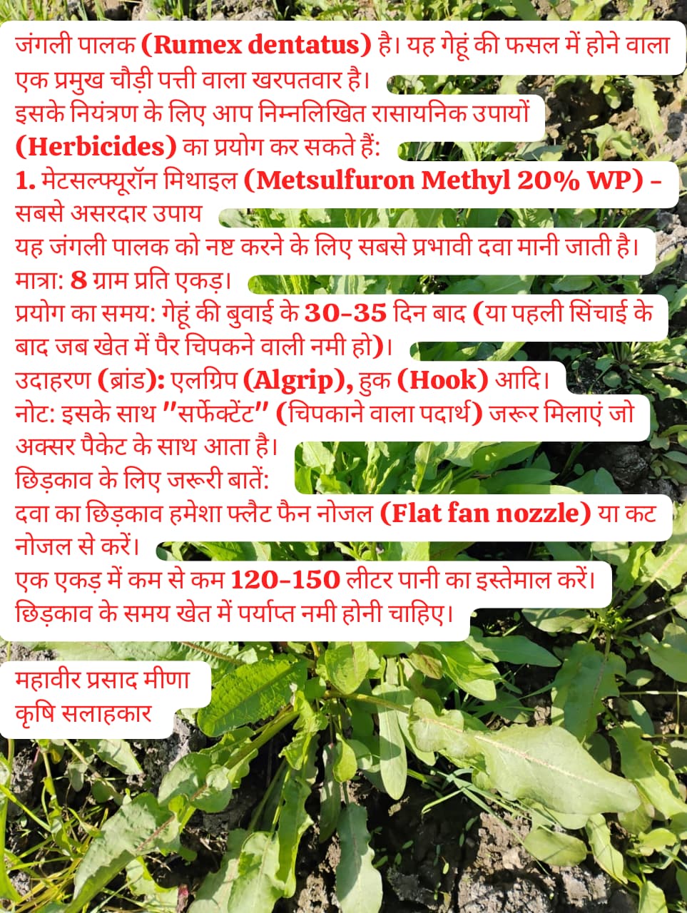 खरपतवार जंगली पालक (Rumex dentatus) है। यह गेहूं की फसल में होने वाला एक प्रमुख चौड़ी पत्ती वाला खरपतवार है।