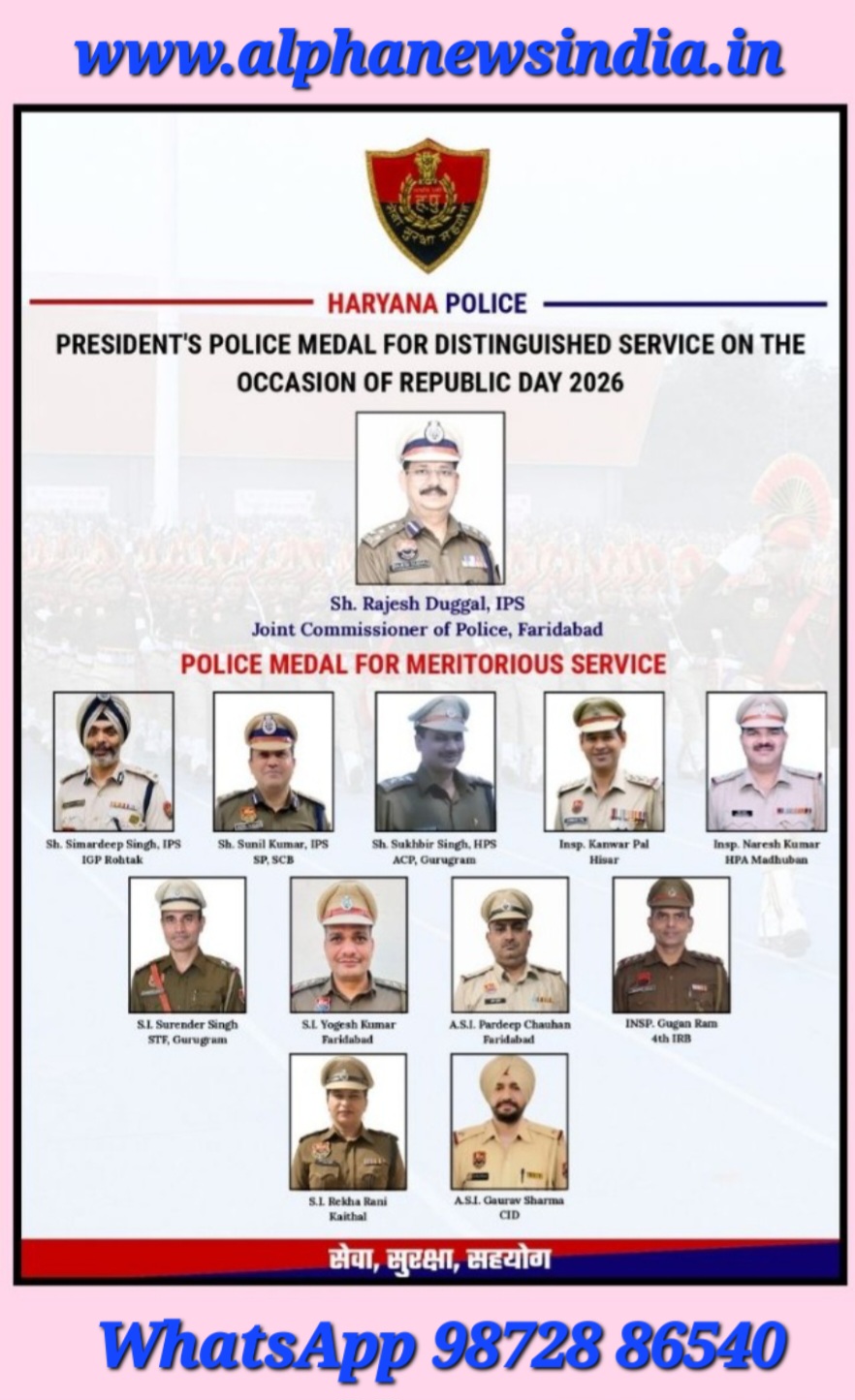 चंडीगढ़ 25 जनवरी 2026 हरीश शर्मा रक्षत शर्मा अश्वनी शर्मा प्रस्तुति---गणतंत्र गणतंत्र दिवस के मौके पर हरियाणा राज्य की पुलिस के एक वरिष्ठ अधिकारी को राष्ट्रपति पुलिस पदक से सम्मानित किया जाएगा l जबकि 12 अन्य पुलिस अधिकारियों व कर्मचारियों को पुलिस पदक (सराहनीय सेवा) प्रदान किया जाएगा। राष्ट्रपति पुलिस पदक से फरीदाबाद के संयुक्त पुलिस आयुक्त राजेश दुग्गल को सम्मानित किया जाएगा।हरियाणा के पुलिस महानिदेशक अजय सिंघल ने सभी सम्मानित अधिकारियों व कर्मचारियों को बधाई देते हुए कहा कि यह उपलब्धि पूरे पुलिस बल के लिए गर्व की बात है। उन्होंने कहा कि यह सम्मान न केवल चयनित अधिकारियों का मनोबल बढ़ाएगा, बल्कि पूरे विभाग को और बेहतर सेवा देने के लिए प्रेरित और प्रोत्साहित भी करेगा।