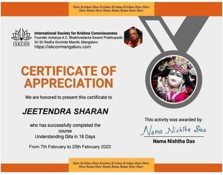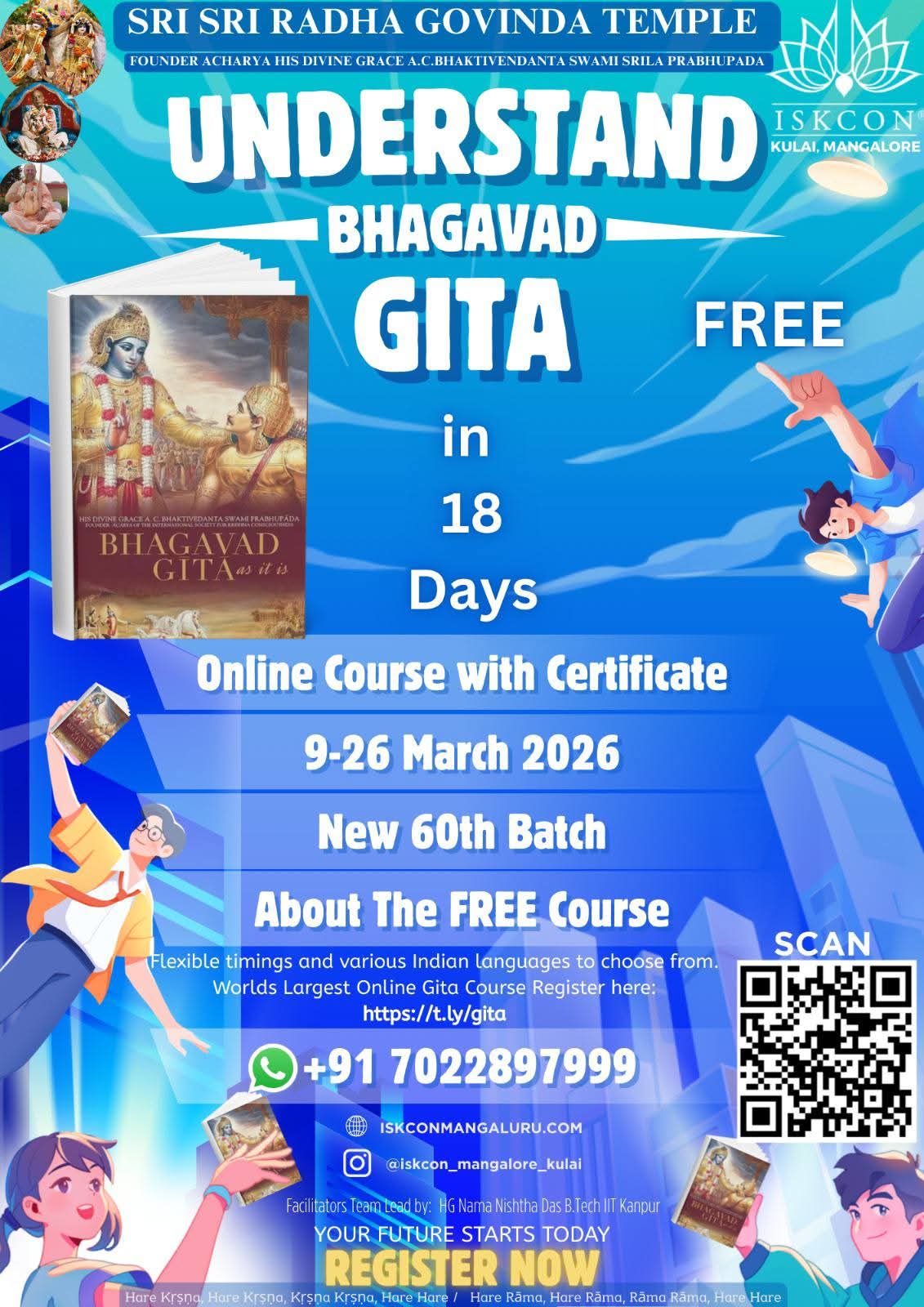 हरे कृष्ण इस्कॉन® कुलाई, मैंगलोर, की वेबसाइट पर *रजिस्टर करें* अपनी भाषा में ऑनलाइन माध्यम से मुफ़्त गीता सीखें 18 दिन मे ,नया बैच समय समय पे होता रहता है। *मुफ़्त प्रमाणपत्र*👇
