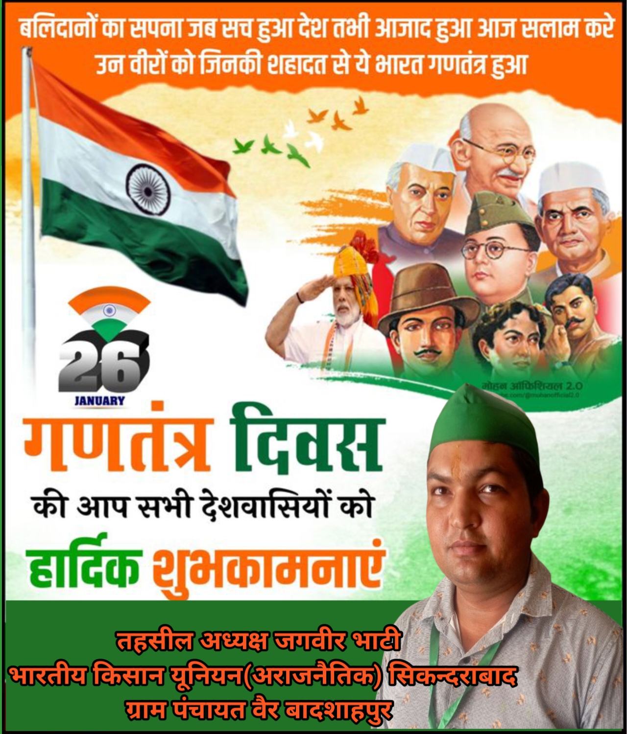 सिकंदराबाद/बुलंदशहर: आज पूरा भारत अपना 77वां गणतंत्र दिवस (2026) हर्षोल्लास के साथ मना रहा है। इस गौरवशाली अवसर पर भारतीय किसान यूनियन (अराजनैतिक) के सिकंदराबाद तहसील अध्यक्ष जगवीर सिंह भाटी ने समस्त क्षेत्रवासियों, देश की सीमाओं पर तैनात वीर जवानों और खेतों में पसीना बहाने वाले किसान भाइयों को अपनी ओर से हार्दिक बधाई प्रेषित की है।