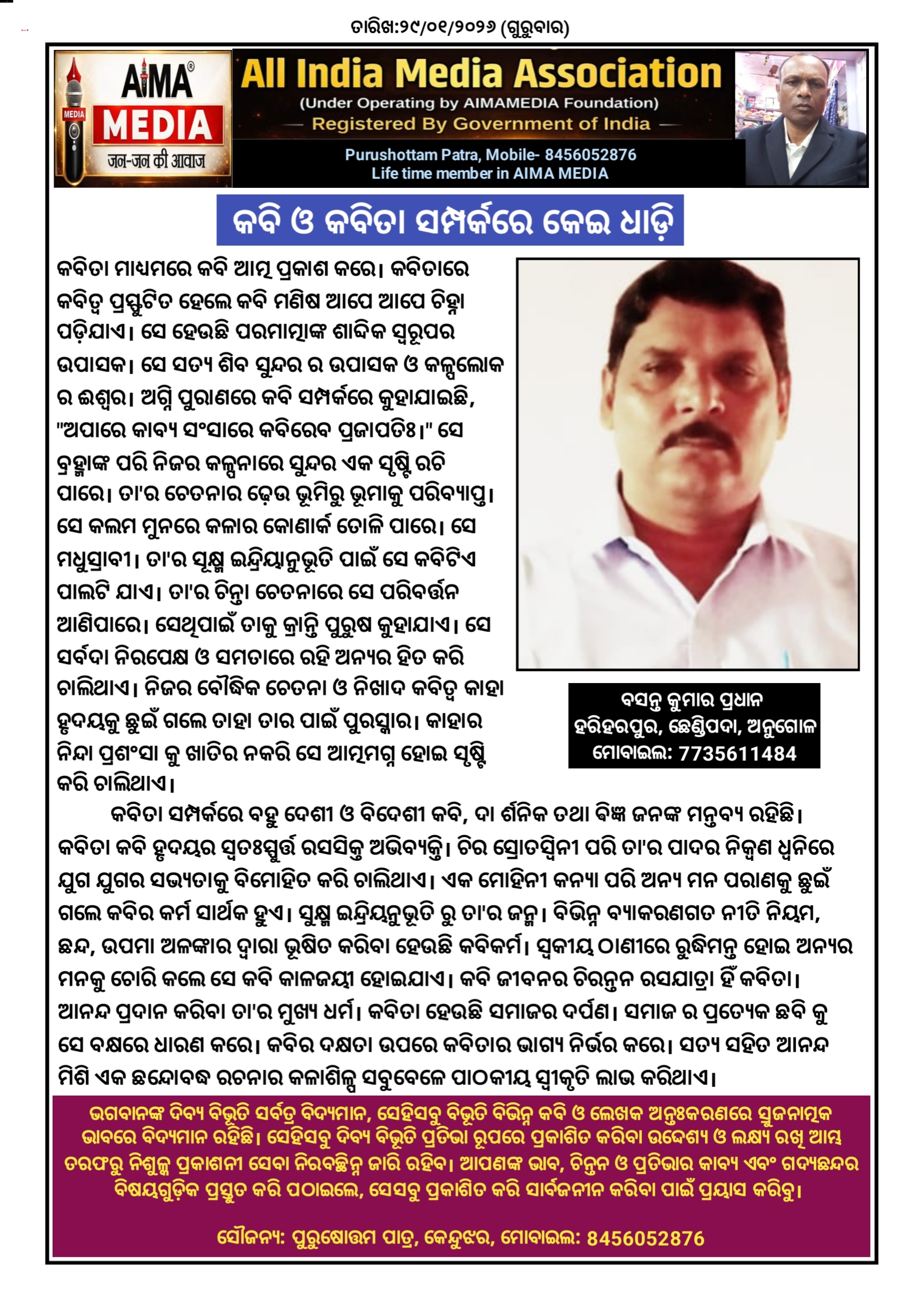 କବିତା ମାଧ୍ୟମରେ କବି ଆତ୍ମ ପ୍ରକାଶ କରେ l କବିତାରେ କବିତ୍ଵ ପ୍ରସ୍ଫୁଟିତ ହେଲେ କବି ମଣିଷ ଆପେ ଆପେ ଚିହ୍ନା ପଡ଼ିଯାଏ l ସେ ହେଉଛି ପରମାତ୍ମାଙ୍କ ଶାବ୍ଦିକ ସ୍ୱରୂପର ଉପାସକ l ସେ ସତ୍ୟ ଶିବ ସୁନ୍ଦର ର ଉପାସକ ଓ କଳ୍ପଲୋକ ର ଈଶ୍ବର l ଅଗ୍ନି ପୁରାଣରେ କବି ସମ୍ପର୍କରେ କୁହାଯାଇଛି, "ଅପାରେ କାବ୍ୟ ସଂସାରେ କବିରେବ ପ୍ରଜାପତିଃ l" ସେ ବ୍ରହ୍ମାଙ୍କ ପରି ନିଜର କଳ୍ପନାରେ ସୁନ୍ଦର ଏକ ସୃଷ୍ଟି ରଚି ପାରେ l ତା'ର ଚେତନାର ଢ଼େଉ ଭୂମିରୁ ଭୂମାକୁ ପରିବ୍ୟାପ୍ତ l ସେ କଲମ ମୁନରେ କଳାର କୋଣାର୍କ ତୋଳି ପାରେ l ସେ ମଧୁସ୍ରାବୀ l ତା'ର ସୂକ୍ଷ୍ମ ଇନ୍ଦ୍ରିୟାନୁଭୂତି ପାଇଁ ସେ କବିଟିଏ ପାଲଟି ଯାଏ l ତା'ର ଚିନ୍ତା ଚେତନାରେ ସେ ପରିବର୍ତ୍ତନ ଆଣିପାରେ l ସେଥିପାଇଁ ତାକୁ କ୍ରାନ୍ତି ପୁରୁଷ କୁହାଯାଏ l ସେ ସର୍ବଦା ନିରପେକ୍ଷ ଓ ସମତାରେ ରହି ଅନ୍ୟର ହିତ କରି ଚାଲିଥାଏ l ନିଜର ବୌଦ୍ଧିକ ଚେତନା ଓ ନିଖାଦ କବିତ୍ଵ କାହା ହୃଦୟକୁ ଛୁଇଁ ଗଲେ ତାହା ତାର ପାଇଁ ପୁରସ୍କାର l କାହାର ନିନ୍ଦା ପ୍ରଶଂସା କୁ ଖାତିର ନକରି ସେ ଆତ୍ମମଗ୍ନ ହୋଇ ସୃଷ୍ଟି କରି ଚାଲିଥାଏ l