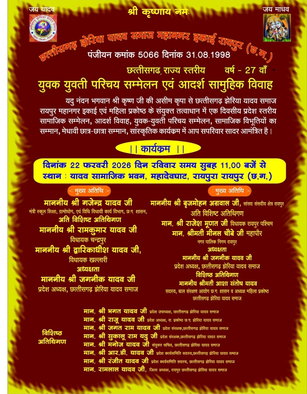 रायपुर 22 फरवरी 2026 को 11 बजे से संबंधित जानकारी के लिए सम्पर्क करे एंव आदर्श विवाह मे सम्मिलित होकर कार्यक्रम को सफल बनाएं