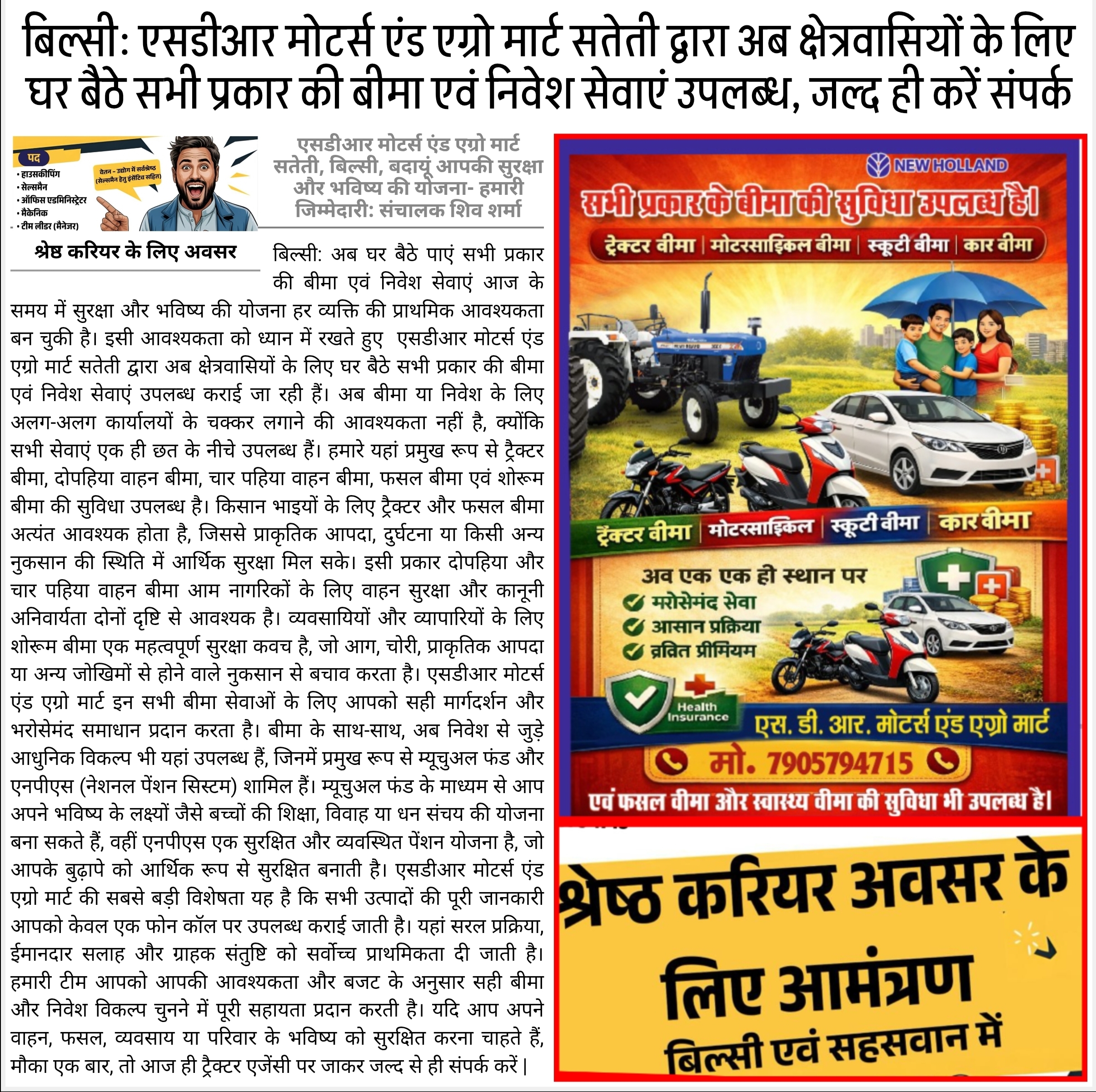 एसडीआर मोटर्स एंड एग्रो मार्ट सतेती द्वारा अब क्षेत्रवासियों के लिए घर बैठे सभी प्रकार की बीमा एवं निवेश सेवाएं उपलब्ध