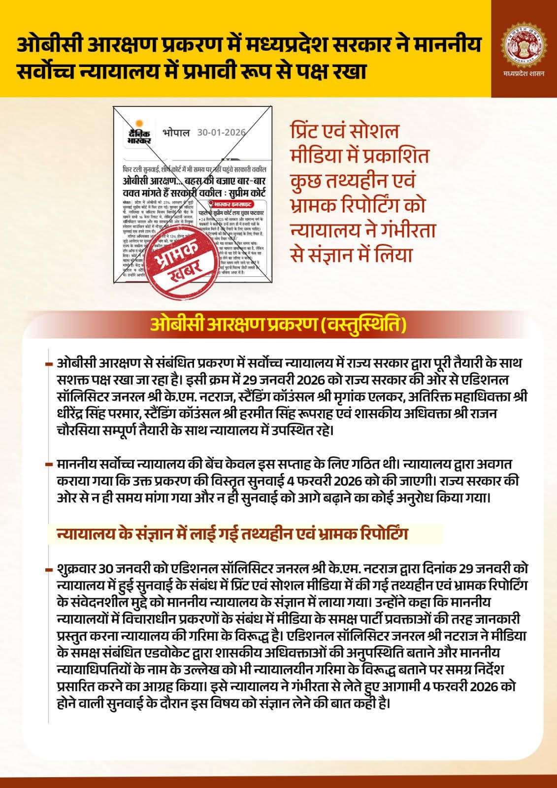ओबीसी आरक्षण से संबंधित प्रकरण में सर्वोच्च न्यायालय में राज्य सरकार द्वारा पूरी तैयारी के साथ सशक्त पक्ष रखा जा रहा है। इसी क्रम में 29 जनवरी 2026 को राज्य सरकार की ओर से एडिशनल सॉलिसिटर जनरल श्री के.एम. नटराज, स्टैंडिंग कॉउंसल श्री मृगांक एलकर, अतिरिक्त महाधिवक्ता श्री धीरेंद्र सिंह परमार, स्टैंडिंग कॉउंसल श्री हरमीत सिंह रूपराह एवं शासकीय अधिवक्ता श्री राजन चौरसिया सम्पूर्ण तैयारी के साथ न्यायालय में उपस्थित रहे।