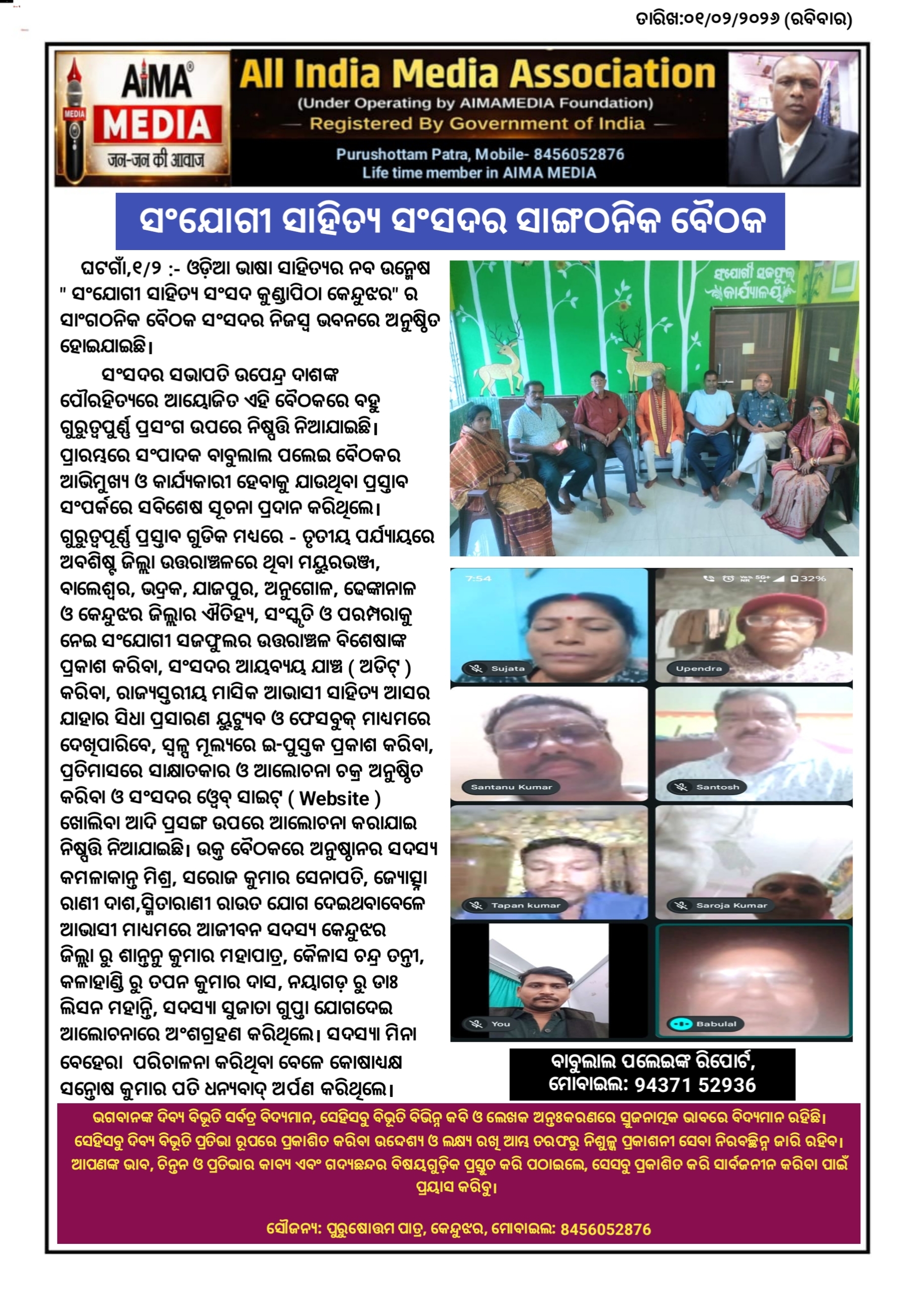 ସଂସଦର ସଭାପତି ଉପେନ୍ଦ୍ର ଦାଶଙ୍କ ପୌରହିତ୍ୟରେ ଆୟୋଜିତ ଏହି ବୈଠକରେ ବହୁ ଗୁରୁତ୍ୱପୁର୍ଣ୍ଣ ପ୍ରସଂଗ ଉପରେ ନିଷ୍ପତ୍ତି ନିଆଯାଇଛି। ପ୍ରାରମ୍ଭରେ ସଂପାଦକ ବାବୁଲାଲ ପଲେଇ ବୈଠକର ଆଭିମୁଖ୍ୟ ଓ କାର୍ଯ୍ୟକାରୀ ହେବାକୁ ଯାଉଥିବା ପ୍ରସ୍ତାବ ସଂପର୍କରେ ସବିଶେଷ ସୂଚନା ପ୍ରଦାନ କରିଥିଲେ। ଗୁରୁତ୍ବପୂର୍ଣ୍ଣ ପ୍ରସ୍ତାବ ଗୁଡିକ ମଧ୍ୟରେ - ତୃତୀୟ ପର୍ଯ୍ୟାୟରେ ଅବଶିଷ୍ଟ ଜିଲ୍ଲା ଉତ୍ତରାଞ୍ଚଳରେ ଥିବା ମୟୁରଭଞ୍ଜ, ବାଲେଶ୍ବର, ଭଦ୍ରକ , ଯାଜପୁର , ଅନୁଗୋଳ, ଢେଙ୍କାନାଳ ଓ କେନ୍ଦୁଝର ଜିଲ୍ଲାର ଐତିହ୍ୟ, ସଂସ୍କୃତି ଓ ପରମ୍ପରାକୁ ନେଇ ସଂଯୋଗୀ ସଜଫୁଲର ଉତ୍ତରାଞ୍ଚଳ ବିଶେଷାଙ୍କ ପ୍ରକାଶ କରିବା, ସଂସଦର ଆୟବ୍ୟୟ ଯାଞ୍ଚ ( ଅଡିଟ୍ ) କରିବା, ରାଜ୍ୟସ୍ତରୀୟ ମାସିକ ଆଭାସୀ ସାହିତ୍ୟ ଆସର ଯାହାର ସିଧା ପ୍ରସାରଣ ୟୁଟ୍ୟୁବ ଓ ଫେସବୁକ୍ ମାଧ୍ୟମରେ ଦେଖିପାରିବେ, ସ୍ବଳ୍ପ ମୂଲ୍ୟରେ ଇ-ପୁସ୍ତକ ପ୍ରକାଶ କରିବା, ପ୍ରତିମାସରେ ସାକ୍ଷାତକାର ଓ ଆଲୋଚନା ଚକ୍ର ଅନୁଷ୍ଠିତ କରିବା ଓ ସଂସଦର ଓ୍ବେବ୍ ସାଇଟ୍ ( Website ) ଖୋଲିବା ଆଦି ପ୍ରସଙ୍ଗ ଉପରେ ଆଲୋଚନା କରାଯାଇ ନିଷ୍ପତ୍ତି ନିଆଯାଇଛି। ଉକ୍ତ ବୈଠକରେ ଅନୁଷ୍ଠାନର ସଦସ୍ୟ କମଳାକାନ୍ତ ମିଶ୍ର, ସରୋଜ କୁମାର ସେନାପତି, ଜ୍ୟୋତ୍ସ୍ନା ରାଣୀ ଦାଶ, ସ୍ମିତାରାଣୀ ରାଉତ ଯୋଗ ଦେଇଥବାବେଳେ ଆଭାସୀ ମାଧ୍ୟମରେ ଆଜୀବନ ସଦସ୍ୟ କେନ୍ଦୁଝର ଜିଲ୍ଲା ରୁ ଶାନ୍ତନୁ କୁମାର ମହାପାତ୍ର, କୈଳାସ ଚନ୍ଦ୍ର ତନ୍ତୀ, କଳାହାଣ୍ଡି ରୁ ତପନ କୁମାର ଦାସ, ନୟାଗଡ଼ ରୁ ଡାଃ ଲିସନ ମହାନ୍ତି , ସଦସ୍ୟା ସୁଜାତା ଗୁପ୍ତା ଯୋଗଦେଇ ଆଲୋଚନାରେ ଅଂଶଗ୍ରହଣ କରିଥିଲେ। ସଦସ୍ୟା ମିନା ବେହେରା ପରିଚାଳନା କରିଥିବା ବେଳେ କୋଷାଧ୍ୟକ୍ଷ ସନ୍ତୋଷ କୁମାର ପତି ଧନ୍ୟବାଦ୍ ଅର୍ପଣ କରିଥିଲେ।