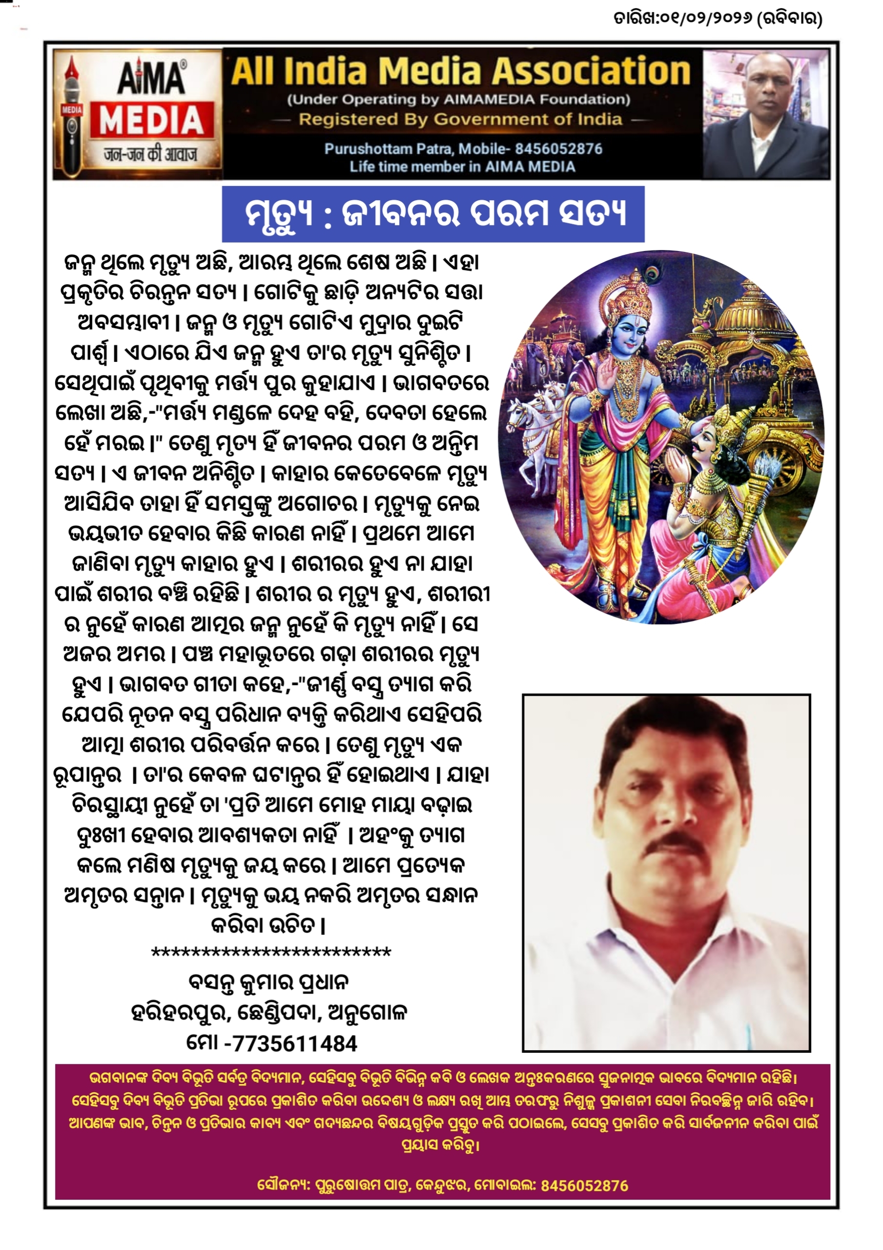 ଜନ୍ମ ଥିଲେ ମୃତ୍ୟୁ ଅଛି, ଆରମ୍ଭ ଥିଲେ ଶେଷ ଅଛି l ଏହା ପ୍ରକୃତିର ଚିରନ୍ତନ ସତ୍ୟ l ଗୋଟିକୁ ଛାଡ଼ି ଅନ୍ୟଟିର ସତ୍ତା ଅବସମ୍ଭାବୀ l ଜନ୍ମ ଓ ମୃତ୍ୟୁ ଗୋଟିଏ ମୁଦ୍ରାର ଦୁଇଟି ପାର୍ଶ୍ୱ l ଏଠାରେ ଯିଏ ଜନ୍ମ ହୁଏ ତା'ର ମୃତ୍ୟୁ ସୁନିଶ୍ଚିତ l ସେଥିପାଇଁ ପୃଥିବୀକୁ ମର୍ତ୍ତ୍ୟ ପୁର କୁହାଯାଏ l ଭାଗବତରେ ଲେଖା ଅଛି,-"ମର୍ତ୍ତ୍ୟ ମଣ୍ଡଳେ ଦେହ ବହି, ଦେବତା ହେଲେ ହେଁ ମରଇ l" ତେଣୁ ମୃତ୍ୟ ହିଁ ଜୀବନର ପରମ ଓ ଅନ୍ତିମ ସତ୍ୟ l ଏ ଜୀବନ ଅନିଶ୍ଚିତ l କାହାର କେତେବେଳେ ମୃତ୍ୟୁ ଆସିଯିବ ତାହା ହିଁ ସମସ୍ତଙ୍କୁ ଅଗୋଚର l ମୃତ୍ୟୁକୁ ନେଇ ଭୟଭୀତ ହେବାର କିଛି କାରଣ ନାହିଁ l ପ୍ରଥମେ ଆମେ ଜାଣିବା ମୃତ୍ୟୁ କାହାର ହୁଏ l ଶରୀରର ହୁଏ ନା ଯାହା ପାଇଁ ଶରୀର ବଞ୍ଚି ରହିଛି l ଶରୀର ର ମୃତ୍ୟୁ ହୁଏ, ଶରୀରୀ ର ନୁହେଁ କାରଣ ଆତ୍ମର ଜନ୍ମ ନୁହେଁ କି ମୃତ୍ୟୁ ନାହିଁ l ସେ ଅଜର ଅମର l ପଞ୍ଚ ମହାଭୂତରେ ଗଢ଼ା ଶରୀରର ମୃତ୍ୟୁ ହୁଏ l ଭାଗବତ ଗୀତା କହେ,-"ଜୀର୍ଣ୍ଣ ବସ୍ତ୍ର ତ୍ୟାଗ କରି ଯେପରି ନୂତନ ବସ୍ତ୍ର ପରିଧାନ ବ୍ୟକ୍ତି କରିଥାଏ ସେହିପରି ଆତ୍ମା ଶରୀର ପରିବର୍ତ୍ତନ କରେ l ତେଣୁ ମୃତ୍ୟୁ ଏକ ରୂପାନ୍ତର l ତା'ର କେବଳ ଘଟାନ୍ତର ହିଁ ହୋଇଥାଏ l ଯାହା ଚିରସ୍ଥାୟୀ ନୁହେଁ ତା 'ପ୍ରତି ଆମେ ମୋହ ମାୟା ବଢ଼ାଇ ଦୁଃଖୀ ହେବାର ଆବଶ୍ୟକତା ନାହିଁ l ଅହଂକୁ ତ୍ୟାଗ କଲେ ମଣିଷ ମୃତ୍ୟୁକୁ ଜୟ କରେ l ଆମେ ପ୍ରତ୍ୟେକ ଅମୃତର ସନ୍ତାନ l ମୃତ୍ୟୁକୁ ଭୟ ନକରି ଅମୃତର ସନ୍ଧାନ କରିବା ଉଚିତ l