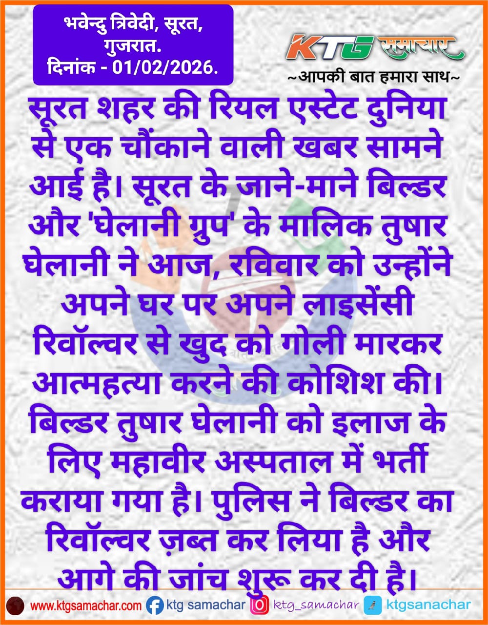 सूरत के जाने-माने बिल्डर तुषार घेलानी ने आज अपने घर पर अपने लाइसेंसी रिवाल्वर से खुद को गोली मारकर आत्महत्या की कोशिश की।