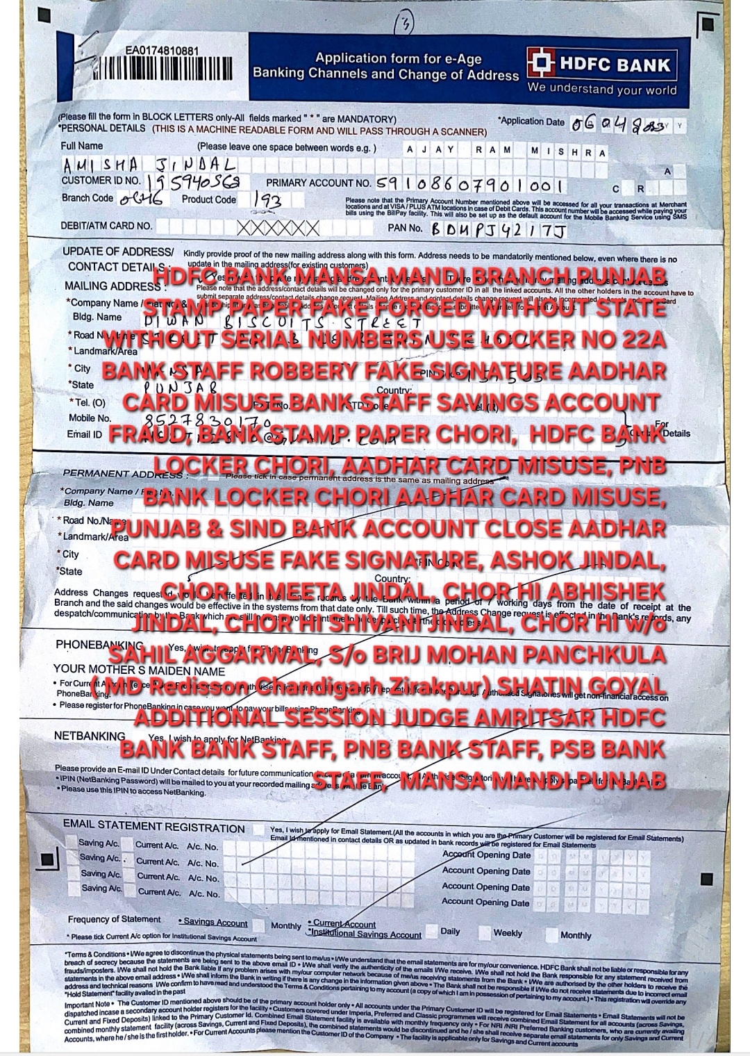 FRAUD, BANK STAMP PAPER, CHORI, HDFC BANK LOCKER CHORI, AADHAR CARD MISUSE, PNB BANK LOCKER CHORI, AADHAR CARD MISUSE, PUNJAB & SIND BANK, ACCOUNT CLOSE, AADHAR CARD MISUSE, FAKE SIGNATURE, ASHOK JINDAL CHOR HI, MEETA JINDAL CHOR HI, ABHISHEK JINDAL CHOR HI, SHIVANI JINDAL CHOR HI, W/o SAHIL AGGARWAL, S/o BRIJ MOHAN, PANCHKULA ( MD. Redisson Chandigarh Zirakpur) SHATIN GOYAL, ADDITIONAL SESSION JUDGE, AMRITSAR, HDFC BANK BANK STAFF, PNB BANK STAFF, PSB BANK STAFF, MANSA MANDI PUNJAB,