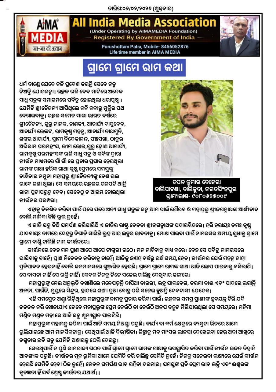 ସେଇଥିପାଇଁ ତ ପୁଣି ରାମରାଜ୍ୟ ଗଠନ ପାଇଁ ଗ୍ରାମେ ଗ୍ରାମେ ରାମଙ୍କ ଗାଥାକୁ ଉପସ୍ଥାପିତ କରିବା ପାଇଁ କୀର୍ତ୍ତନ ଭଜନ ନିହାତି ଆବଶ୍ୟକ ପଡୁଛି। କୀର୍ତ୍ତନର ମୂଳ ଭୂମିକା ଆମେ ଯେମିତି କରି ଚାଲିଛୁ ସେମିତି ନୁହେଁ। ନିଜକୁ ସଜେଇବା ଲକ୍ଷ୍ୟରେ ଯେଉଁ କୀର୍ତ୍ତନ ହେଉଛି ସେମିତି ହେବା ଠିକ ନୁହେଁ। କେବଳ ସମର୍ପଣ ଭାବ ରହିବା ଦରକାର। ସମସ୍ତଙ୍କ ପ୍ରତି ପ୍ରେମ ଭାବ ଭକ୍ତି ଏବଂ ଈଶ୍ୱରଙ୍କ କୃତଜ୍ଞତା ହିଁ ସର୍ବ ଶ୍ରେଷ୍ଠ କୀର୍ତ୍ତନର ଯଥାର୍ଥ।।